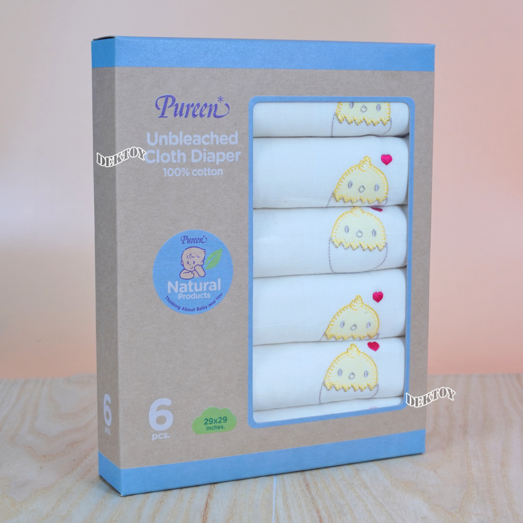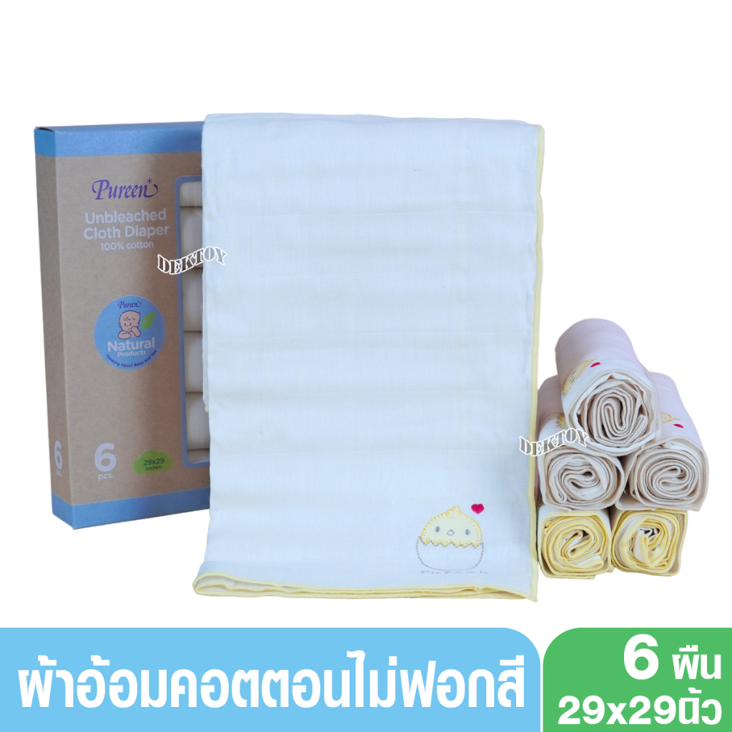 Pureen เพียวรีน ผ้าอ้อมคอตตอนเพียวรีนไม่ฟอกขาว Cotton USA 2 ชั้นไซส์ 29 x 29 นิ้ว แพ็ค 6 ผืน