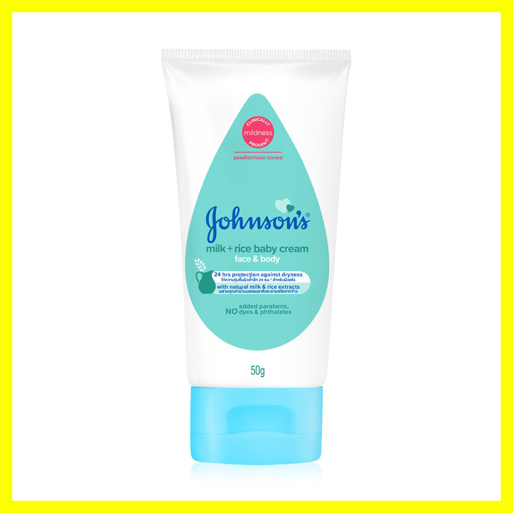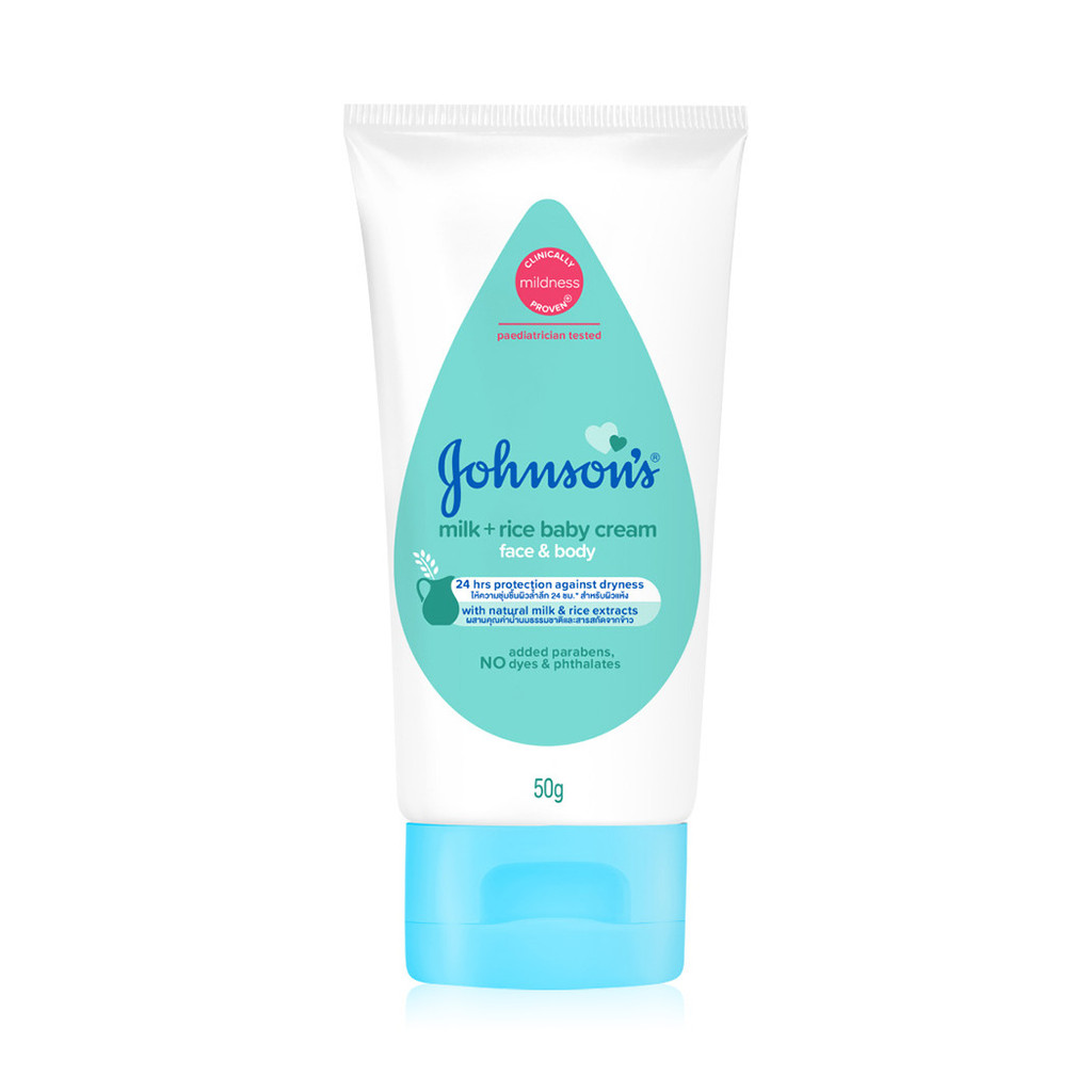 Johnsons Baby Milk + Rice Cream 50g จอห์นสัน ผสานคุณค่าน้ำนมธรรมชาติและสารสกัดจากข้าว เพื่อการบำรุงผิวตลอดวัน.