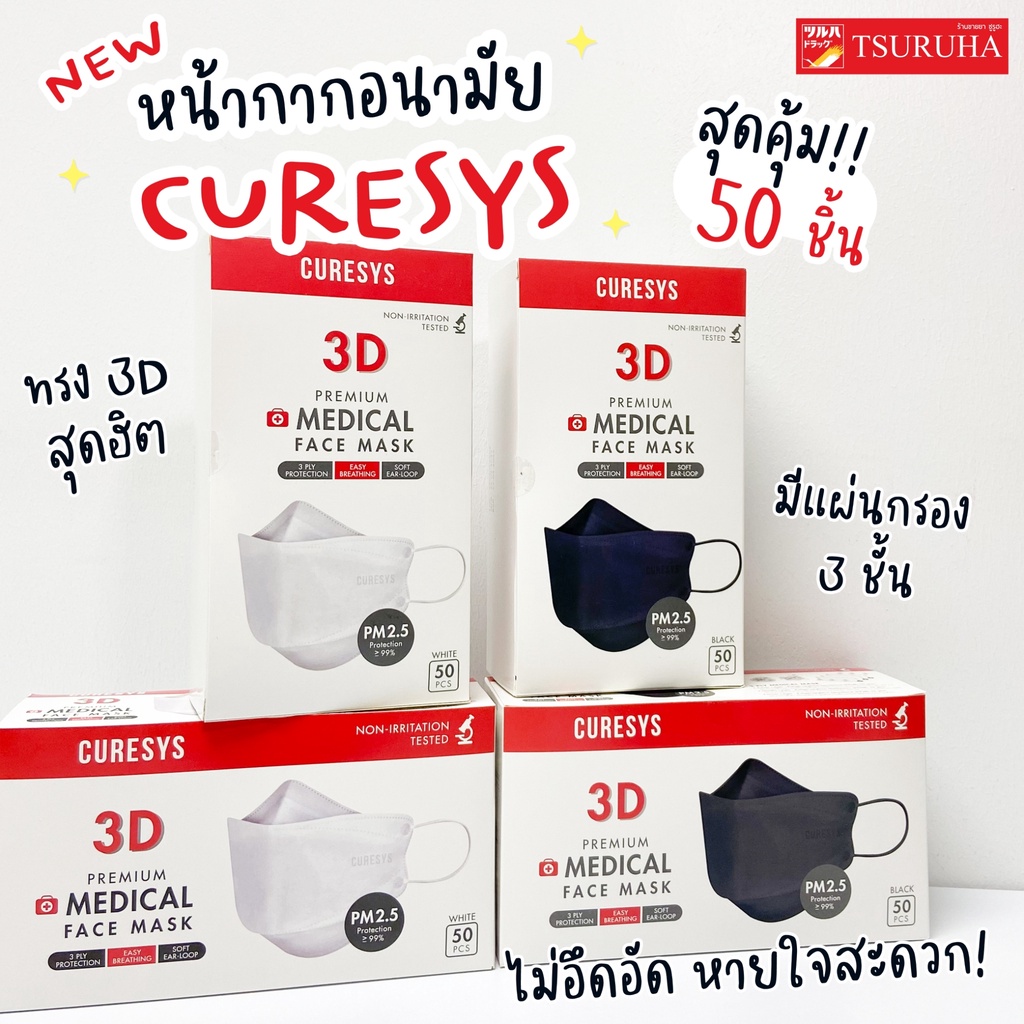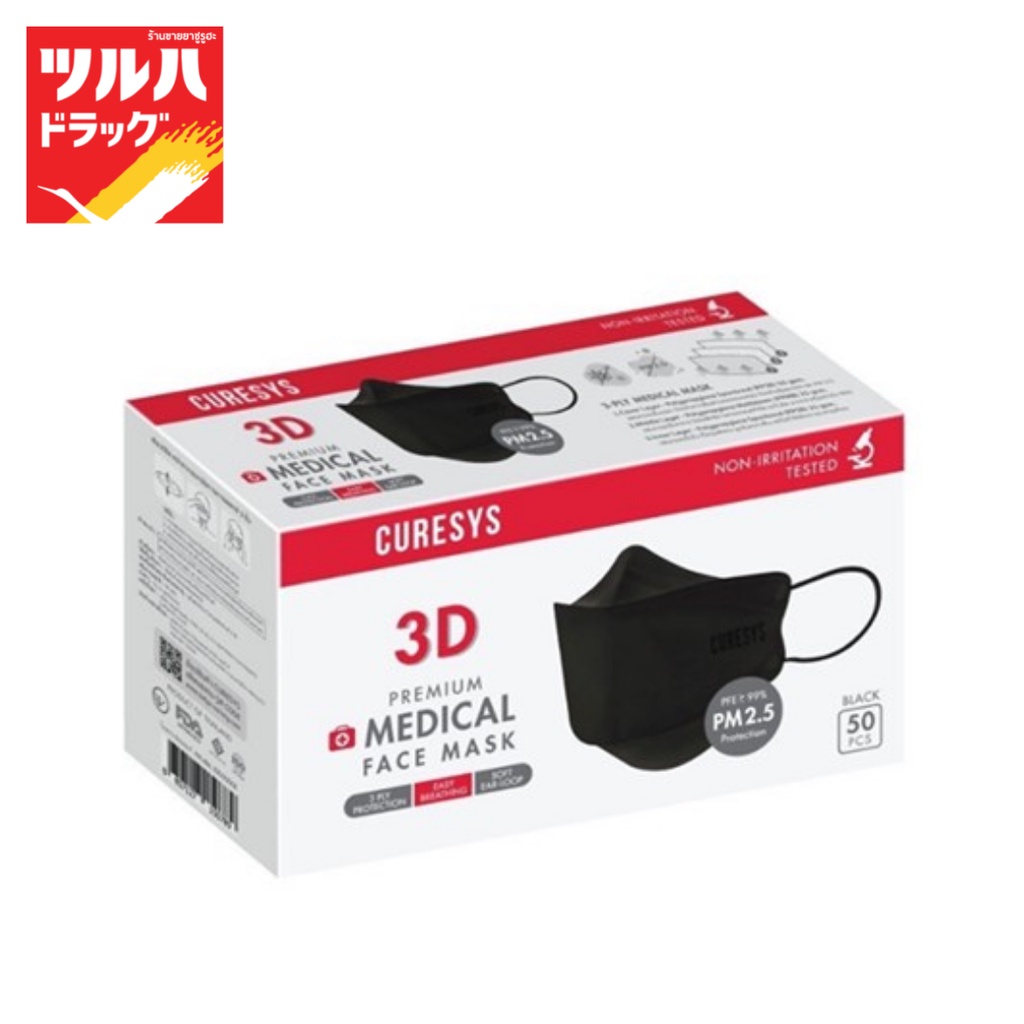 เคียวร์ซิส หน้ากากอนามัย 3 ชั้น 50 ชิ้น สีดำ/Curesys 3D Premium Medical Face Mask 50 pcs Black