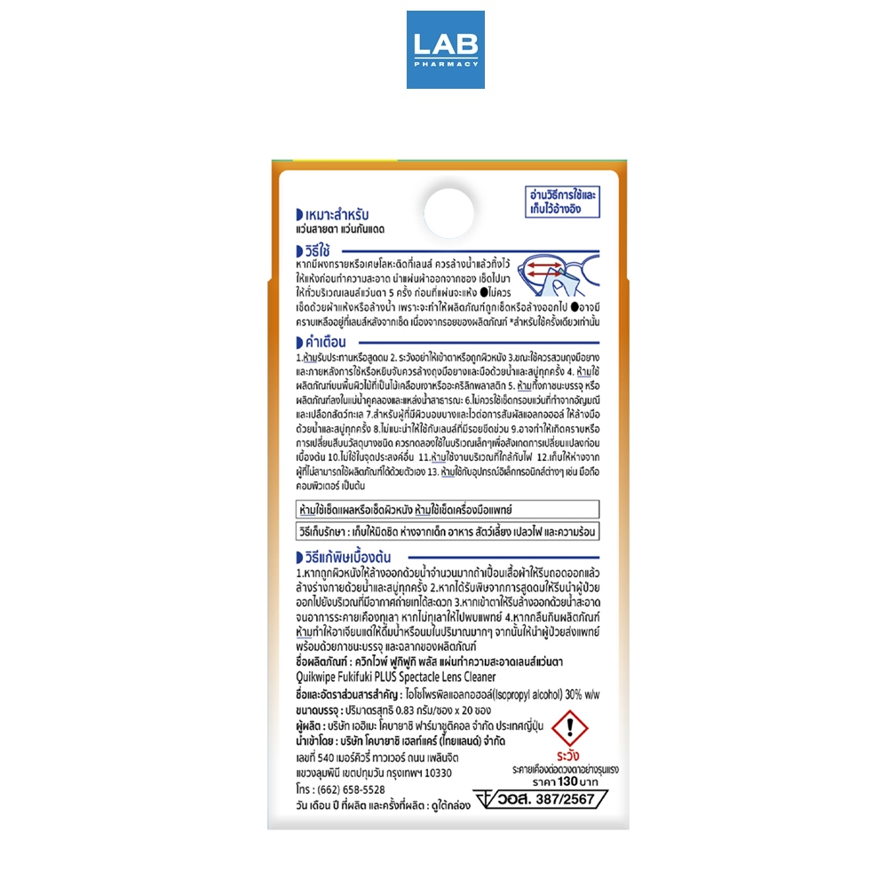 Quikwipe Fukifuki PLUS Spectacle Lens Cleaner 20 sachets ควิกไวป์ ฟุกิฟุกิ พลัส ผ้าเช็ดเลนส์แว่นตา แบบซอง 20 แผ่น
