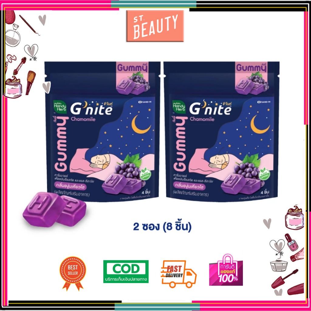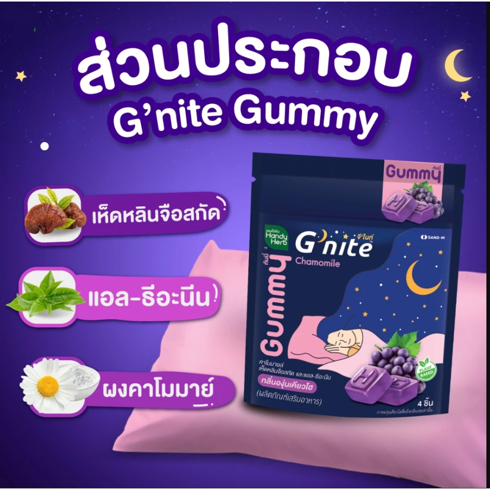 (2ซอง)HandyHerb G'nite Gummy จี'ไนท์ กัมมี่ เคี้ยวก่อนนอน กลิ่นองุ่นเคียวโฮ 2 ซอง (8 ชิ้น)