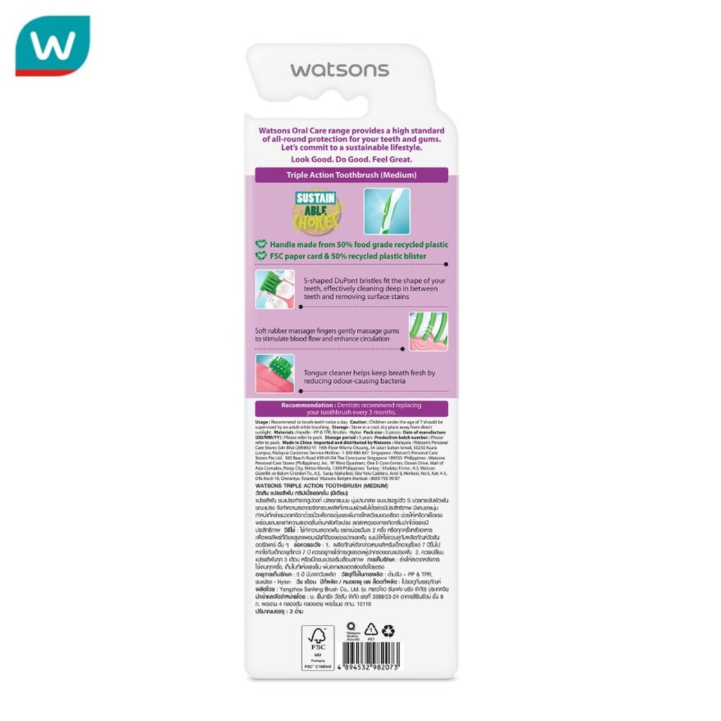 Watsons วัตสัน แปรงสีฟัน ทริปเปิ้ลแอคชั่น (มีเดียม) 3ด้าม.
