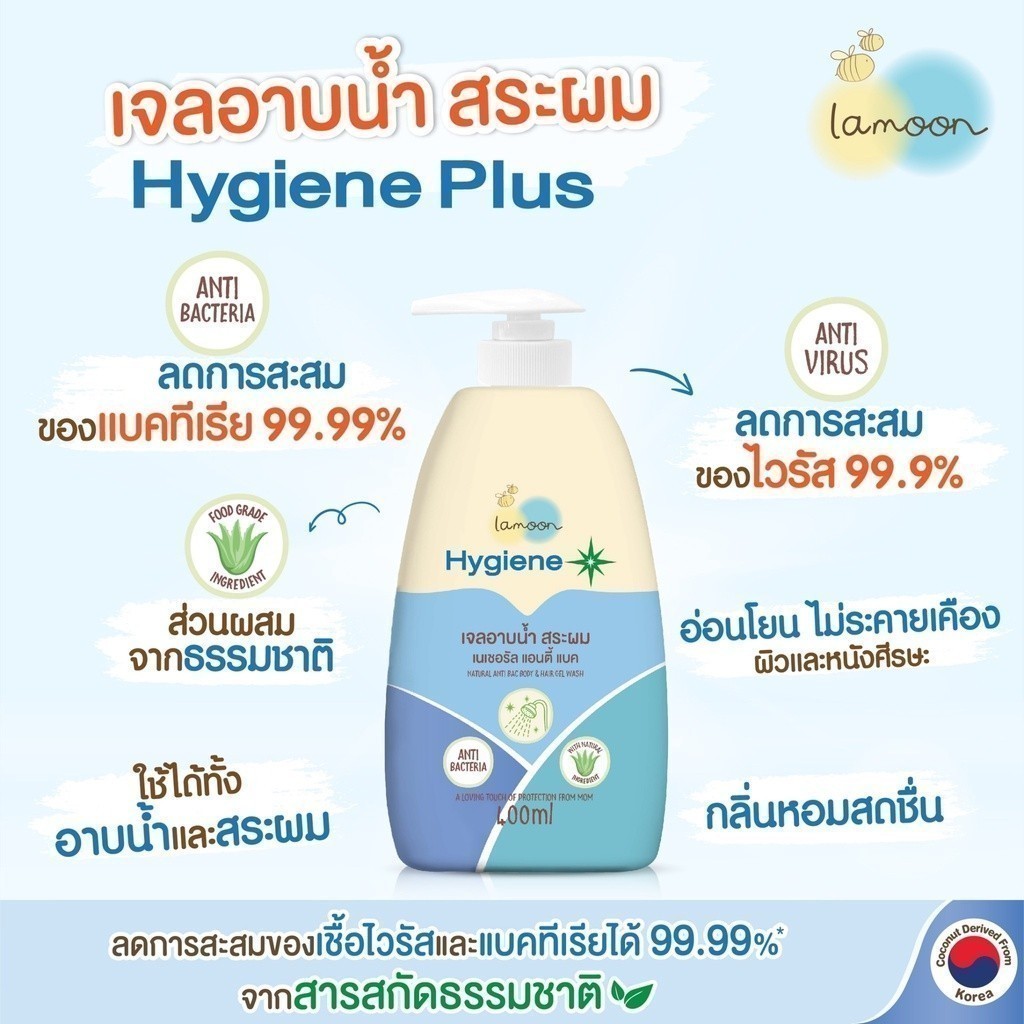 Lamoon ไฮจีนพลัส เจลอาบน้ำสระผม ป้องกันไวรัส สำหรับเด็กอายุ 3 ขวบขึ้นไป ฆ่าเชื้อไวรัสและแบคทีเรียได้ในขวดเดียว ละมุน