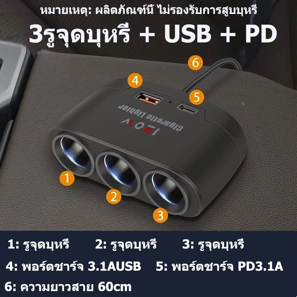 3-in-1 รถปลั๊กชาร์จอะแดปเตอร์ไฟแช็กหลายซ็อกเก็ต Dual USB Car Cigarette Lighter Splitter