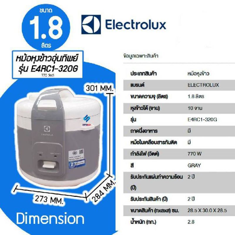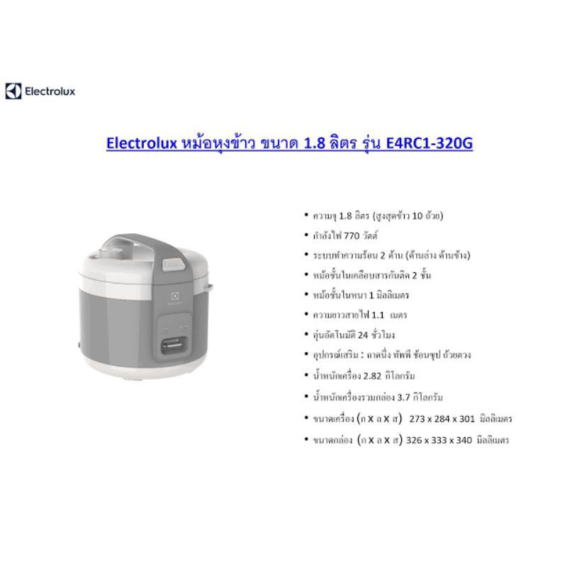 ELECTROLUX หม้อหุงข้าวอุ่นทิพย์ เคลือบเทฟล่อน 1.8ลิตร 770 วัตต์ สีเทา รุ่นE4RC1320G