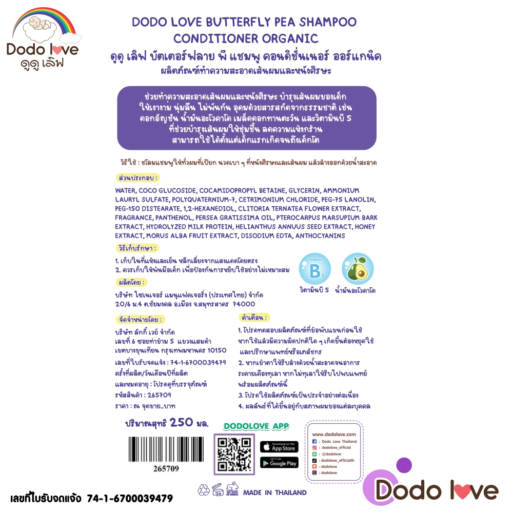 DODOLOVE บัตเตอร์ฟลาย พี แชมพู คอนดิชั่นเนอร์ ออร์แกนิค แชมพูเด็กอัญชัน แชมพูเด็ก อ่อนโยน