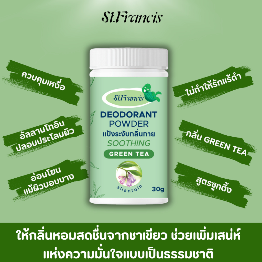 ST.FRANCIS แป้งระงับกลิ่นกาย สูตร Soothing กลิ่น GREEN TEA 30g. แห้งสบาย อ่อนโยนต่อผิว