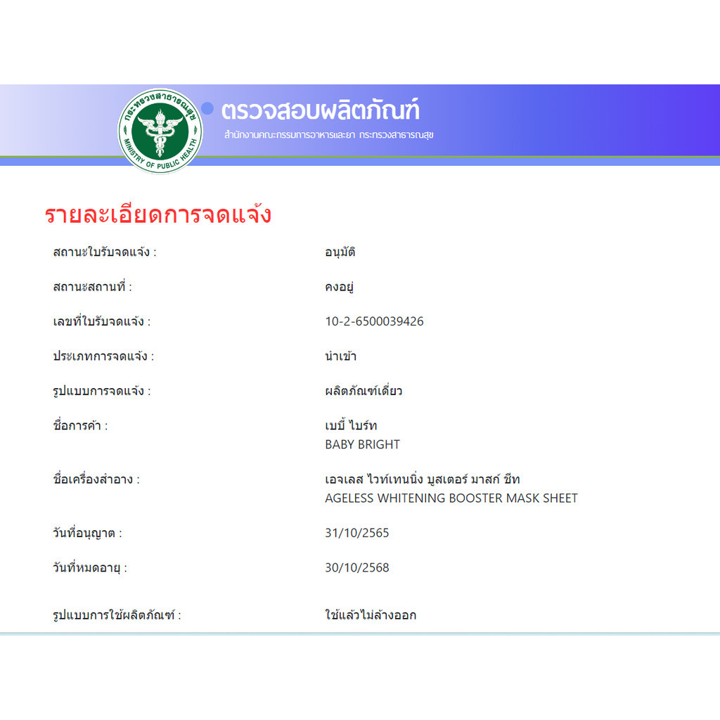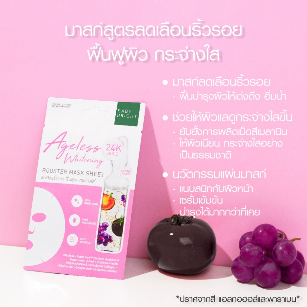 (6แผ่น/กล่อง) Baby Bright Ageless Whitening Booster Mask Sheet แผ่นมาสก์หน้า บูสเตอร์ สูตร กระชับใส ❤