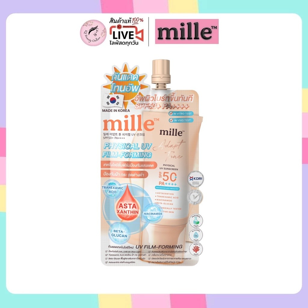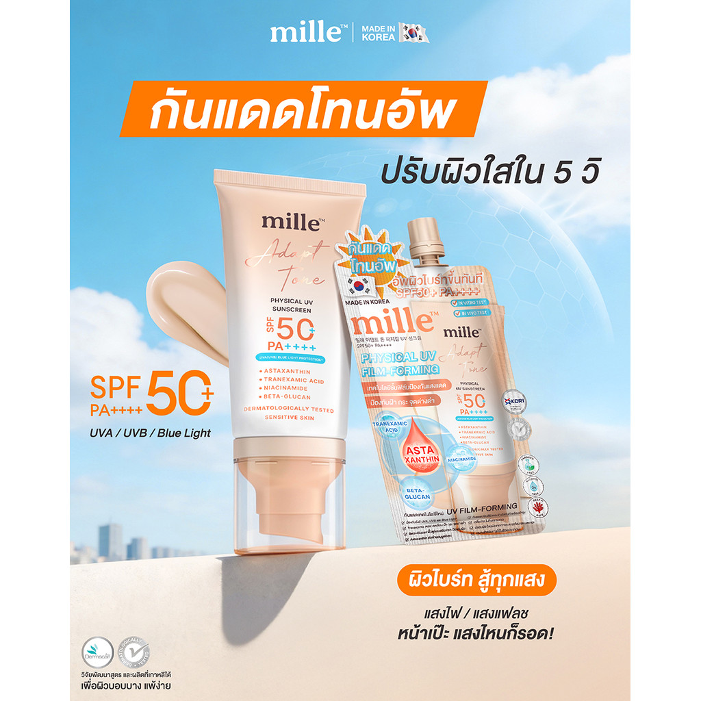 (1ซอง) มิลเล่ กันแดดโทนอัพบำรุงผิว Mille Adapt Tone Physical UV Sunscreen SPF50+ PA++++ 6g.