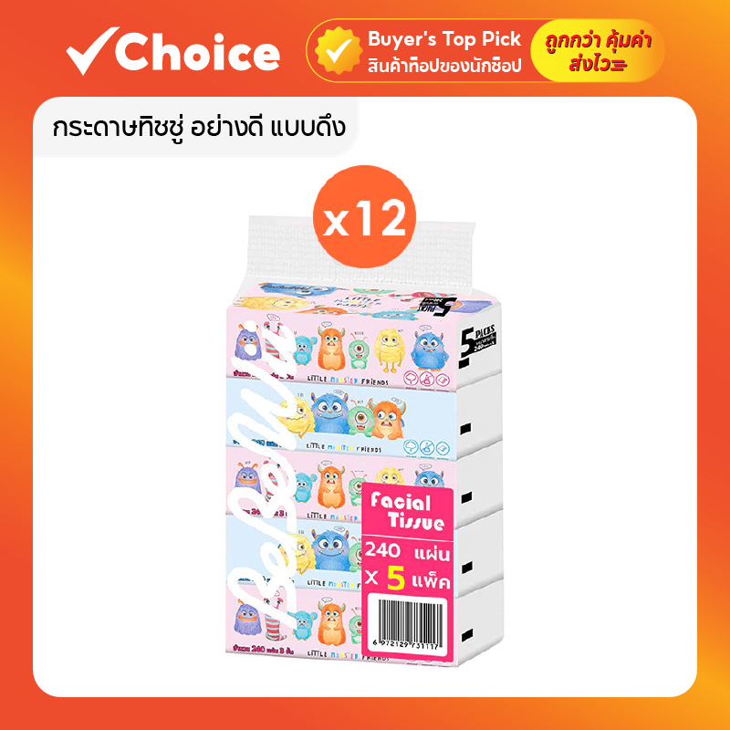 [แพ็ค 12] กระดาษทิชชู่ อย่างดี แบบดึง ขนาด175*175มม 240เเผ่น /ห่อ หนา 3 ชั้น เช็ดหน้า เช็ดมือขนาดพกพา 5 ห่อ x12