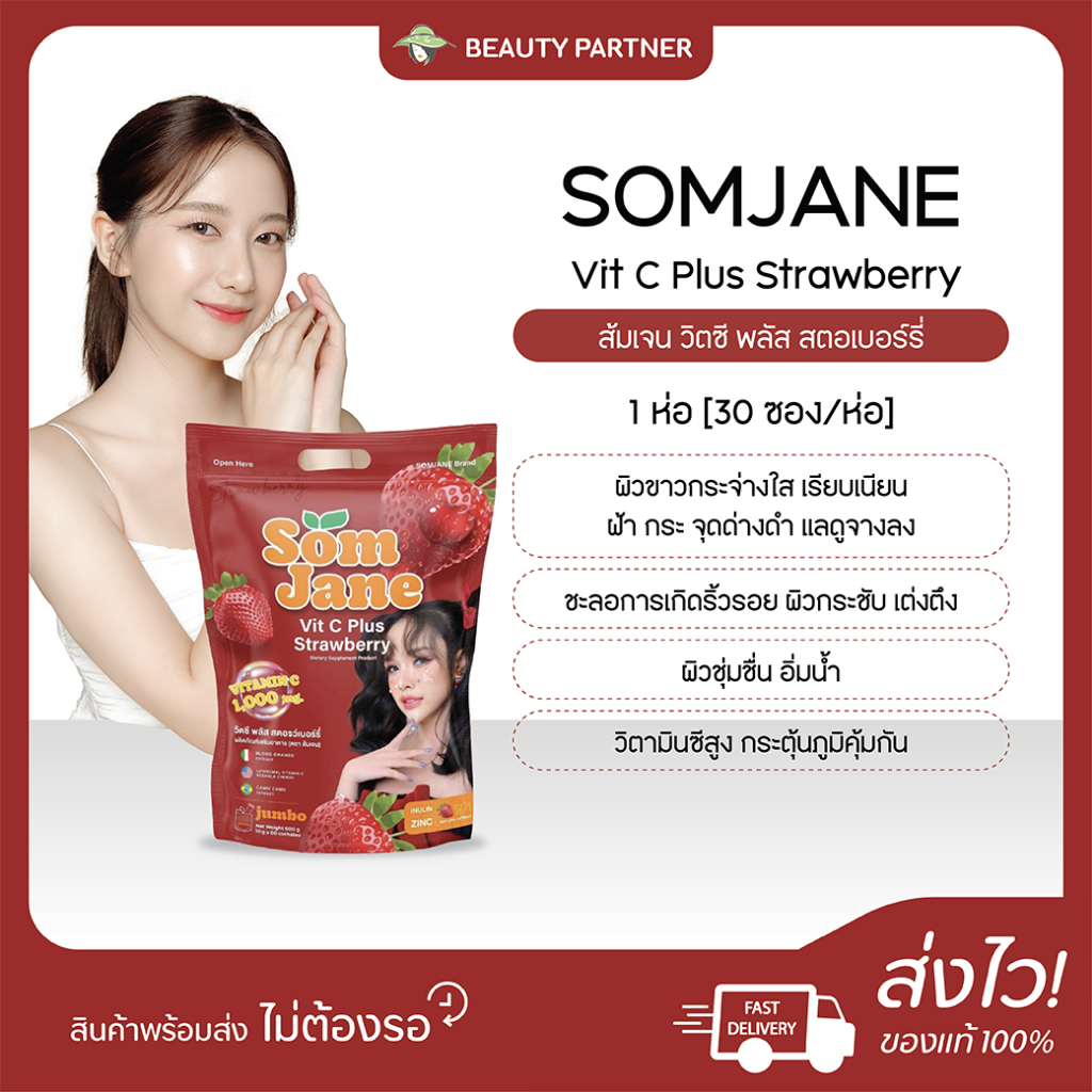 SOMJANE ส้มเจน วิตซี พลัส บลัดออเร้นจ์ / SOMJANE Vit C Plus Strawberry ส้มเจน วิตซี พลัส สตอเบอรร์รี่ [1 ห่อ] [30 ซอง]