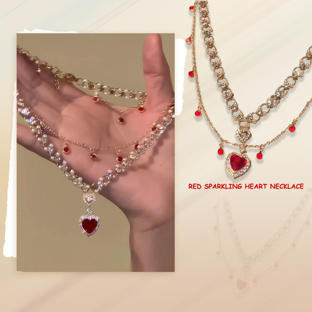 Gothic Double layered คริสตัลสีแดงจี้หัวใจ Pearl Chain สร้อยคอผู้หญิงงานแต่งงาน