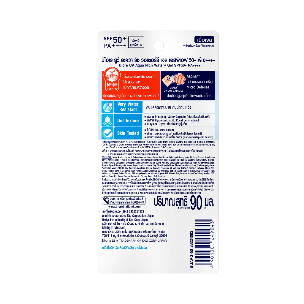 บิโอเร ยูวี อะควา วอเตอร์รี่ เจล SPF50 90 มล./Biore UV Aqua Rich Watery Gel SPF50+ PA++++ 90ml