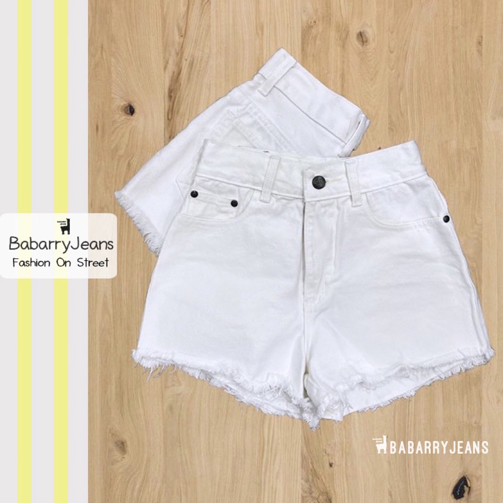 BabarryJeans ยีนส์ขาสั้น เอวสูง ปลายรุ่ย ผ้ายีนส์ไม่ยืด สีขาว