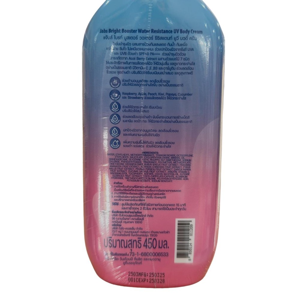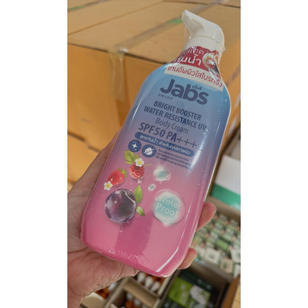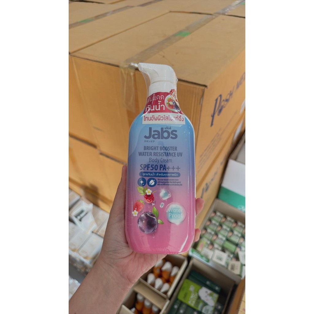 1 ขวด สูตรกันน้ำ ครีม กันแดด Jabs Bright Booster Water Resistance Body Cream SPF50 PA+++ 450 ml.
