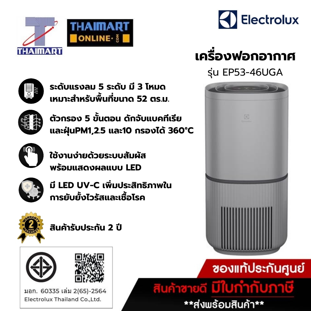 Electrolux เครื่องฟอกอากาศ (กรอง 5ขั้นตอน (Pre, Anti-bacterial HEPA, HEPA13, Activated Carbon, UV-C) ) รุ่น EP53-46UGA
