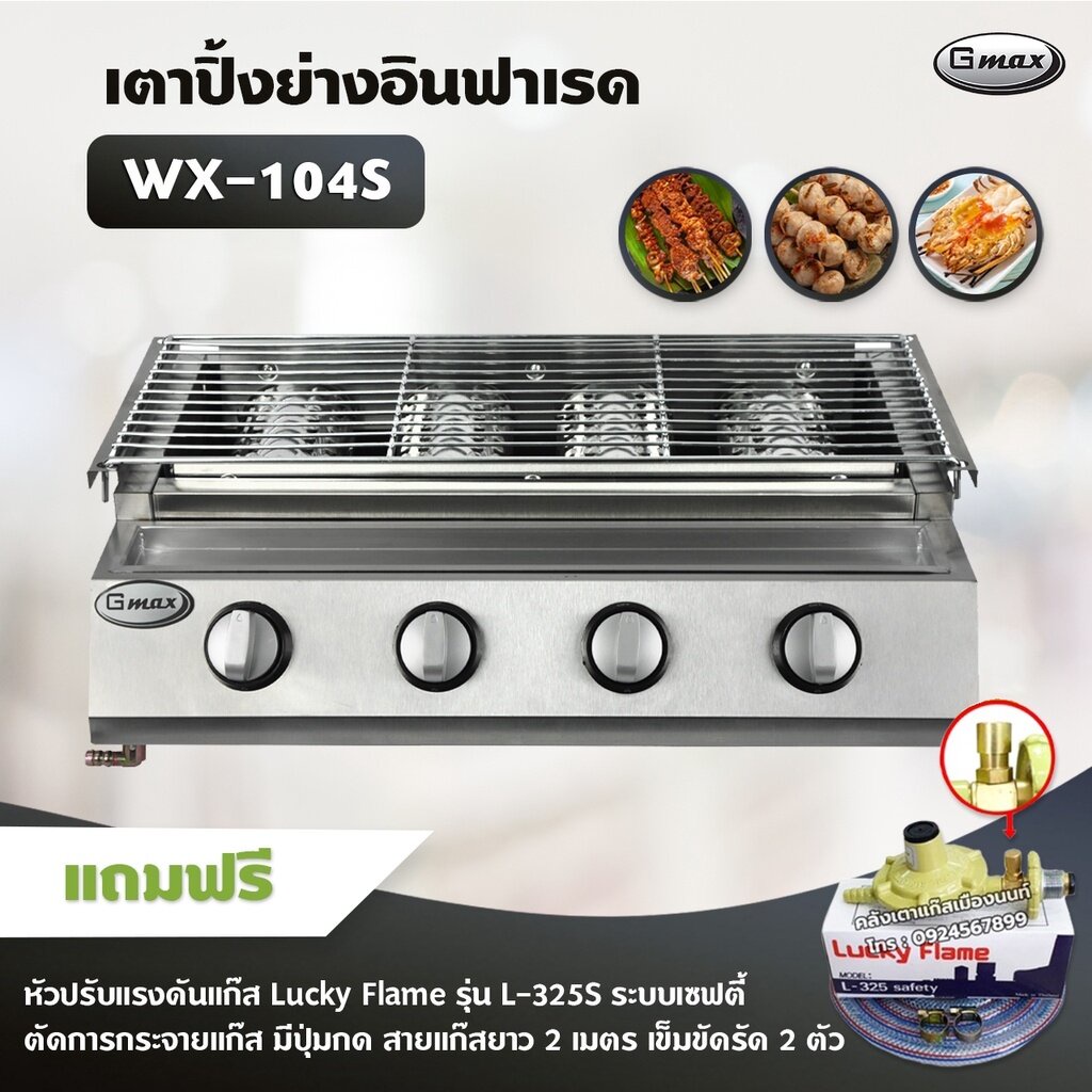 Gmax เตาปิ้งย่าง รุ่น WX-104S หัวเตาแก๊สอินฟาเรด 4 หัว ไร้ควัน ย่างบาร์บีคิว BBQ (พร้อมหัวปรับเซฟตี้มีปุ่มกดครบชุด)