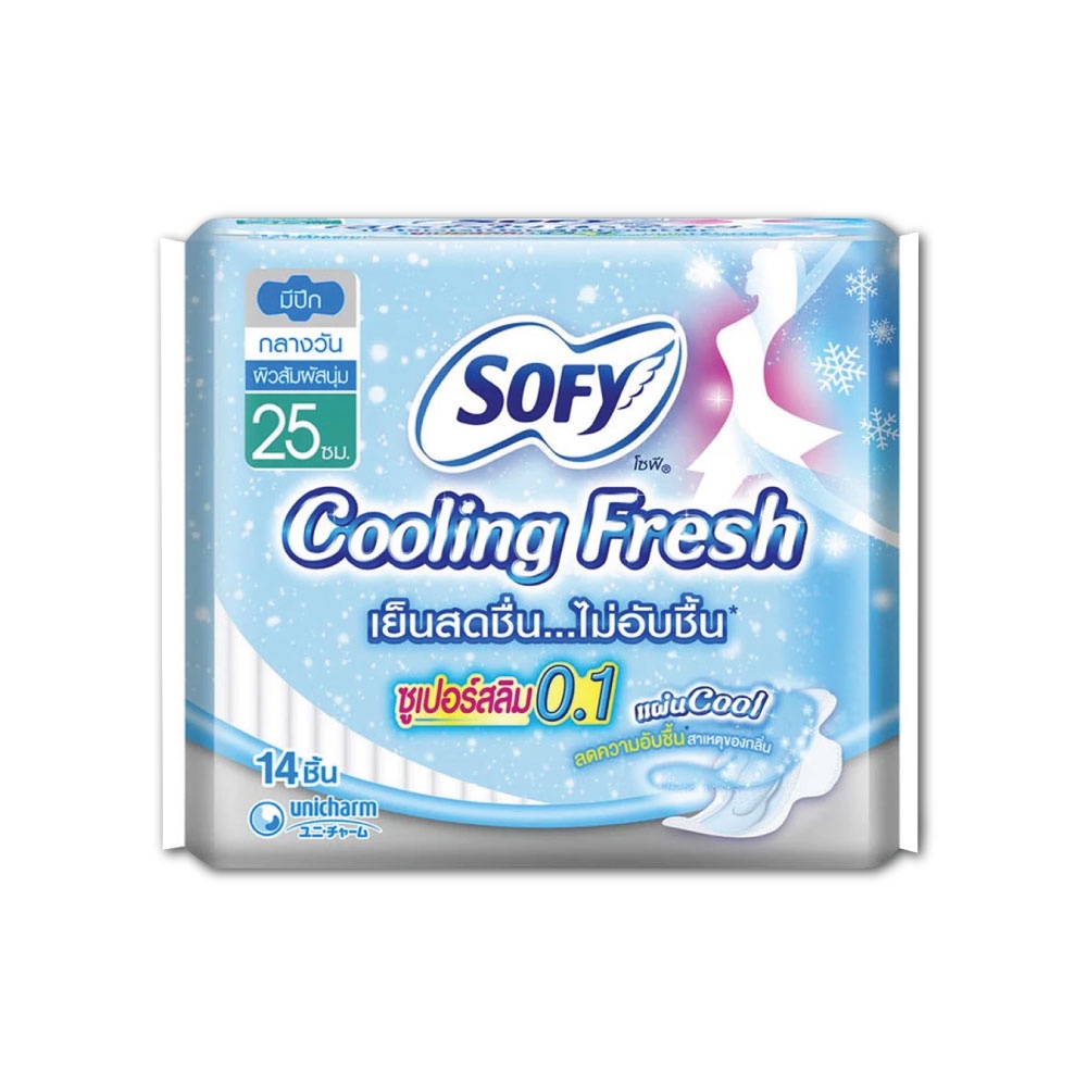 Sofy Cooling Fresh Sanitary Super Slim 0.1 Wing 25cm. 14pcs. โซฟีคูลลิ่งเฟรชผ้าอนามัยซูเปอร์สลิม 0.1 มีปีก 25ซม. 14ชิ้น