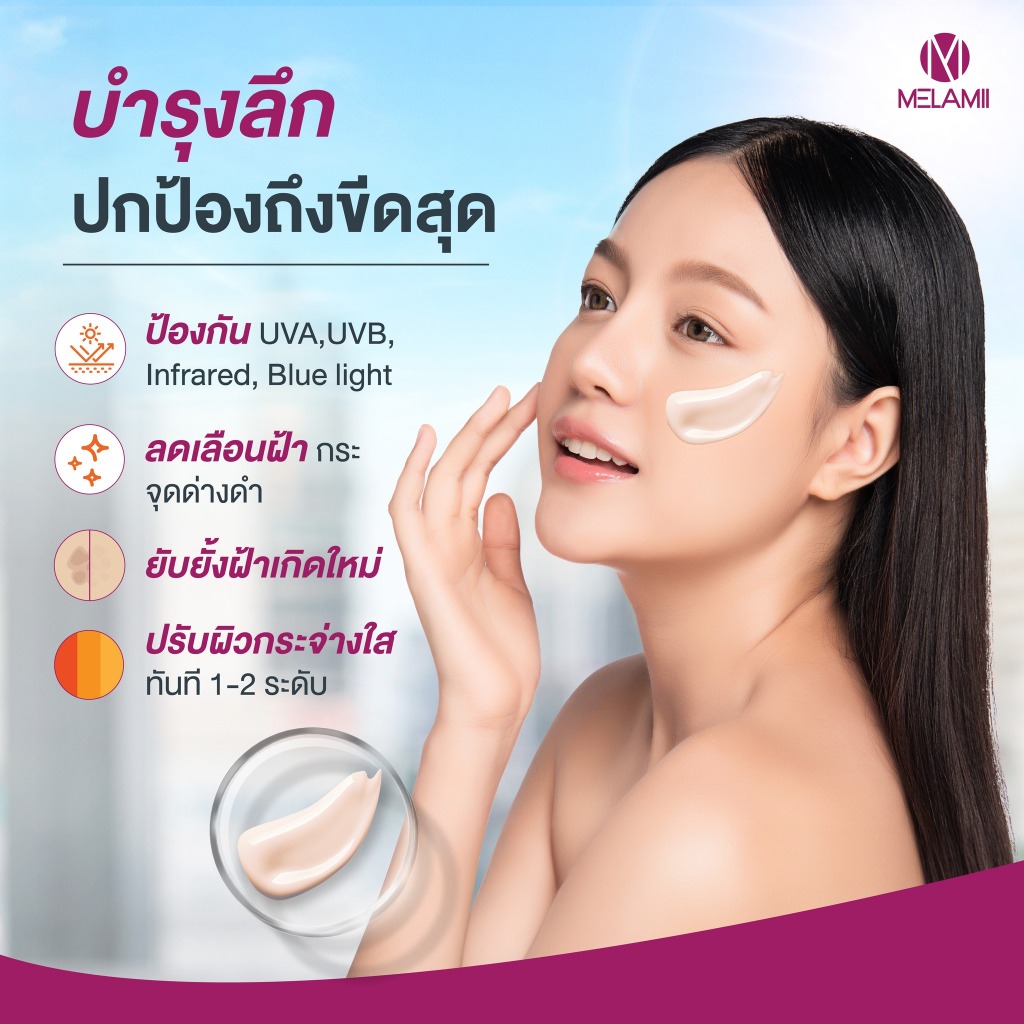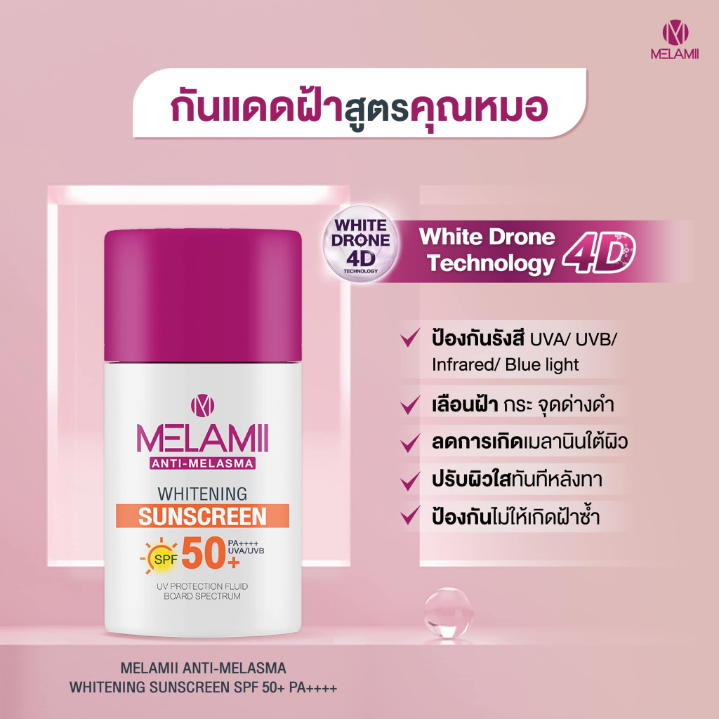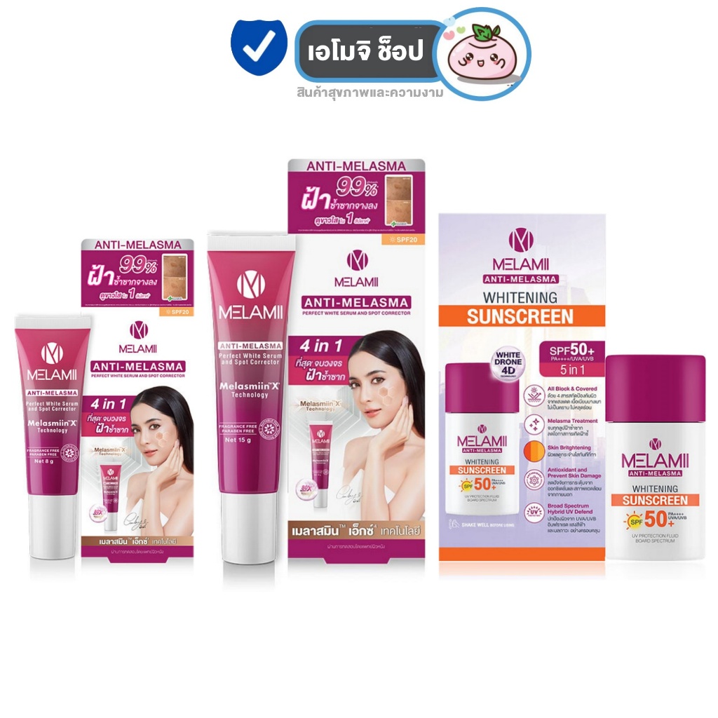 Melamii Anti Melasma เมลามิ แอนติ เมลาสม่า [เลือกขนาด] / Melamii Anti Melasma Whitening Sunscreen SPF50+ [30 ml./กล่อง]
