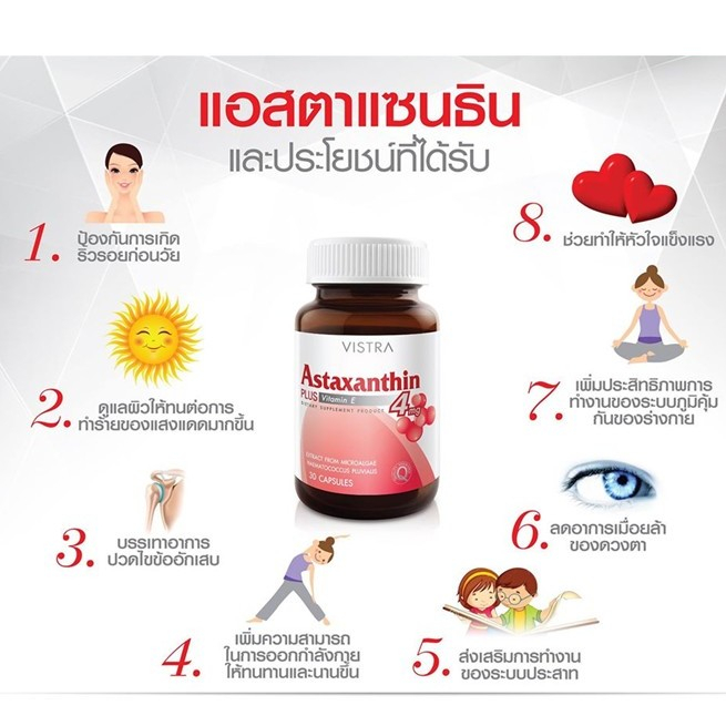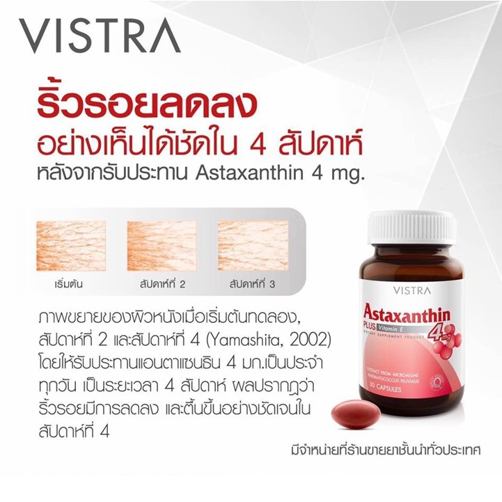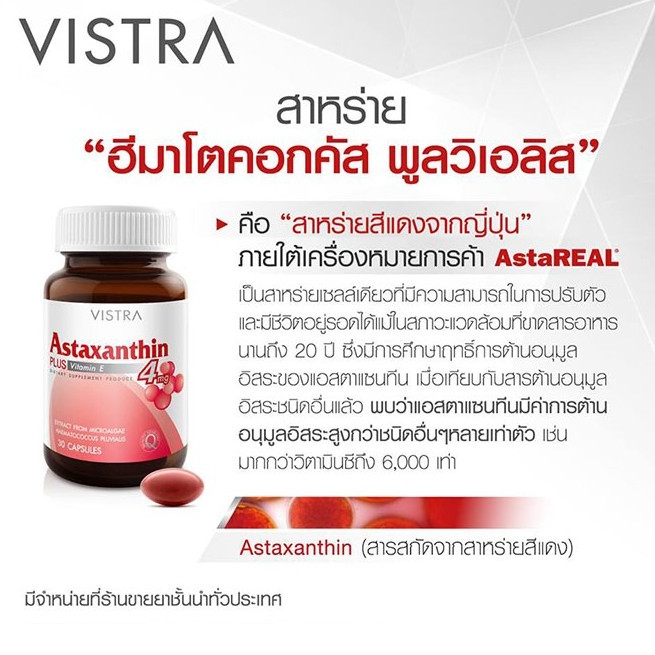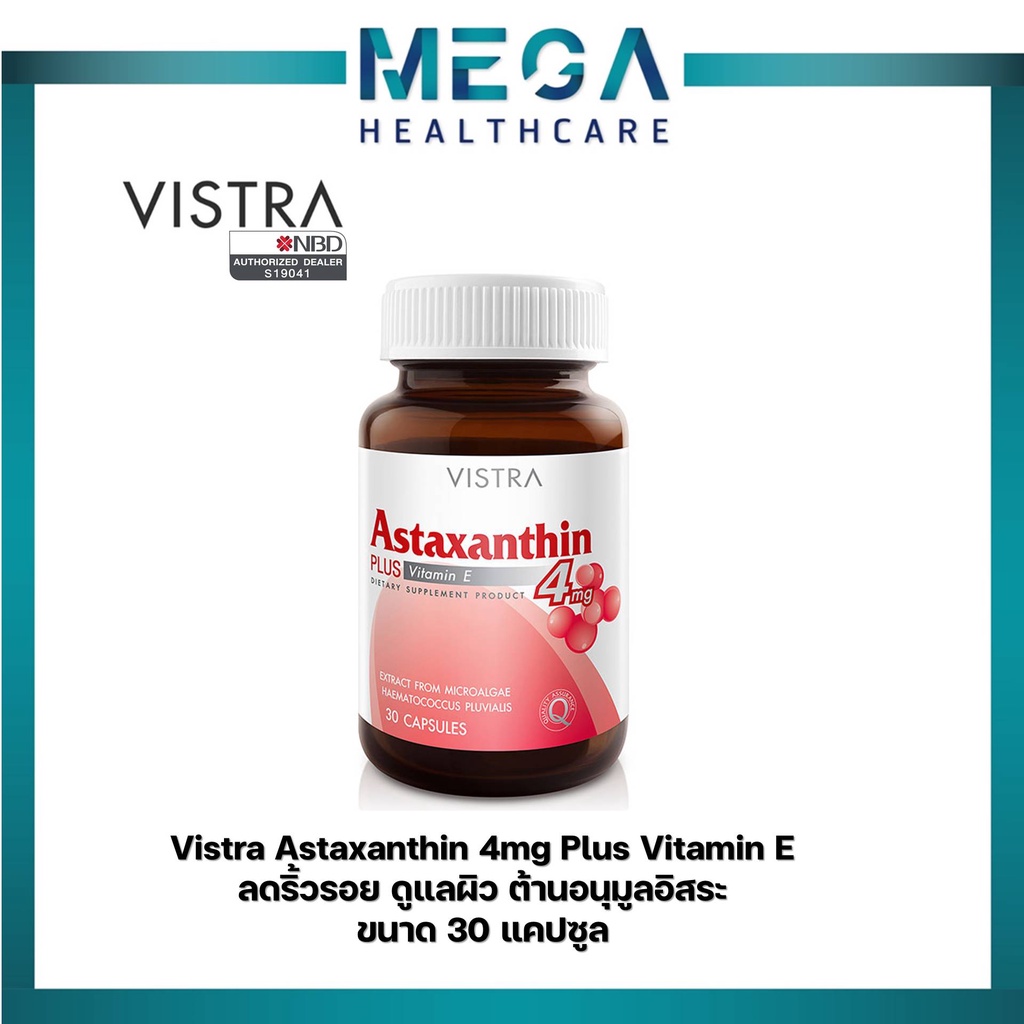 VISTRA Astaxanthin 4 mg Plus Vitamin E วิสทร้า แอสตาแซนธิน 4 มก. +วิตามินอี (30 แคปซูล)