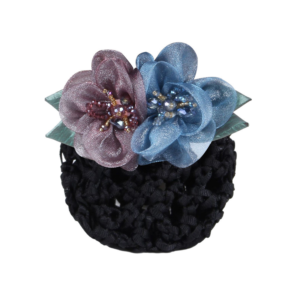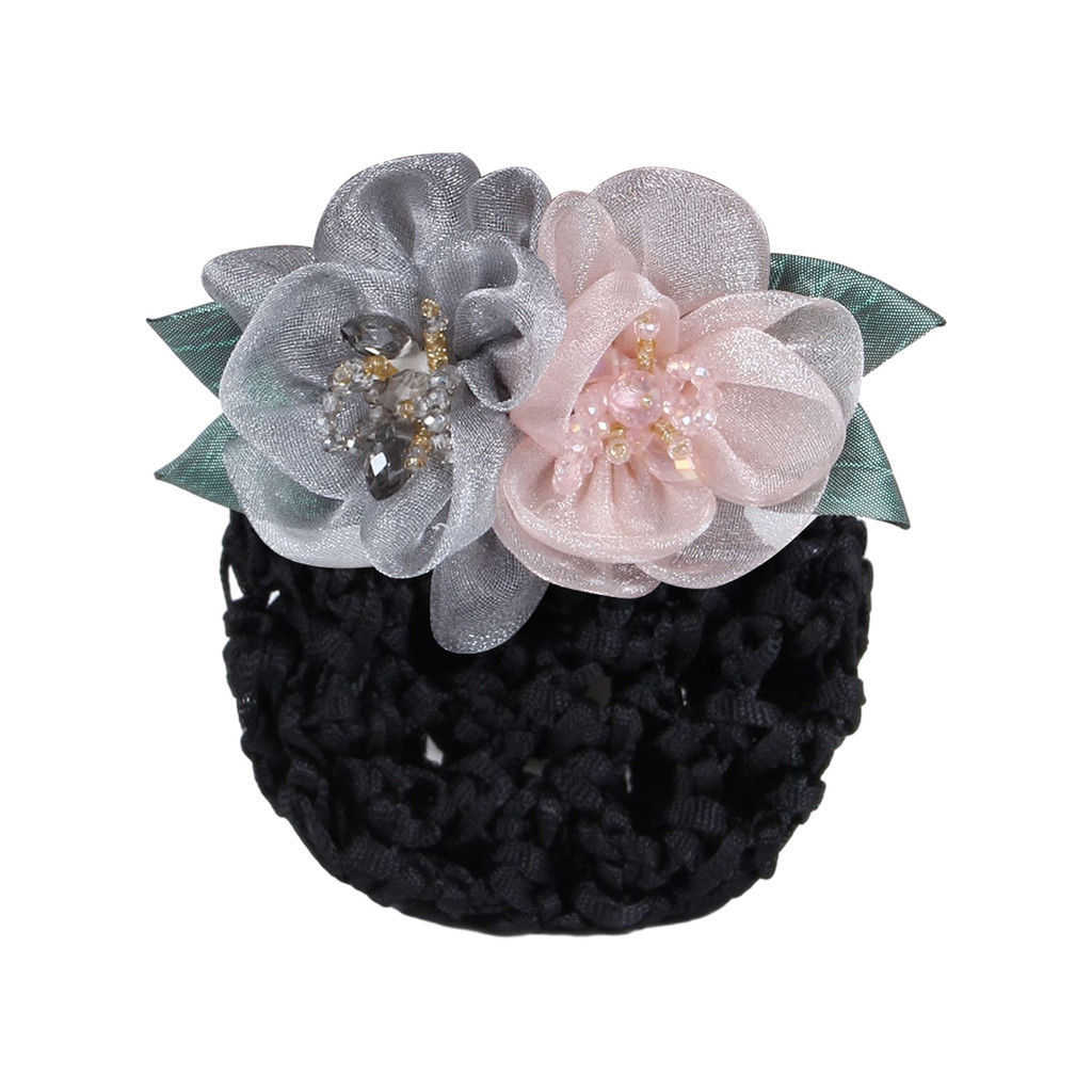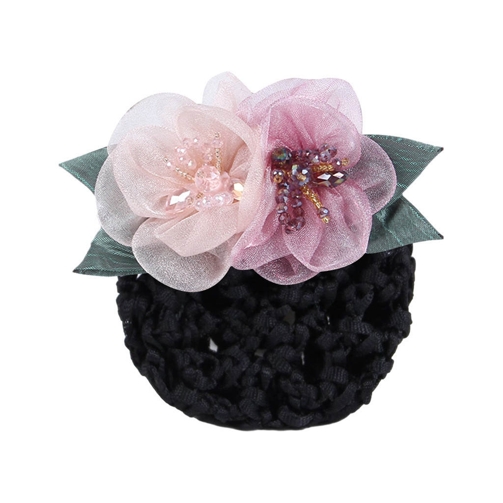 [YUE]ผู้หญิงผมสุทธิริบบิ้นดอกไม้ลูกปัด Bun Net Hairgrip Elegant Elastic Hair Barrette อุปกรณ์จัดแต่งทรงผม