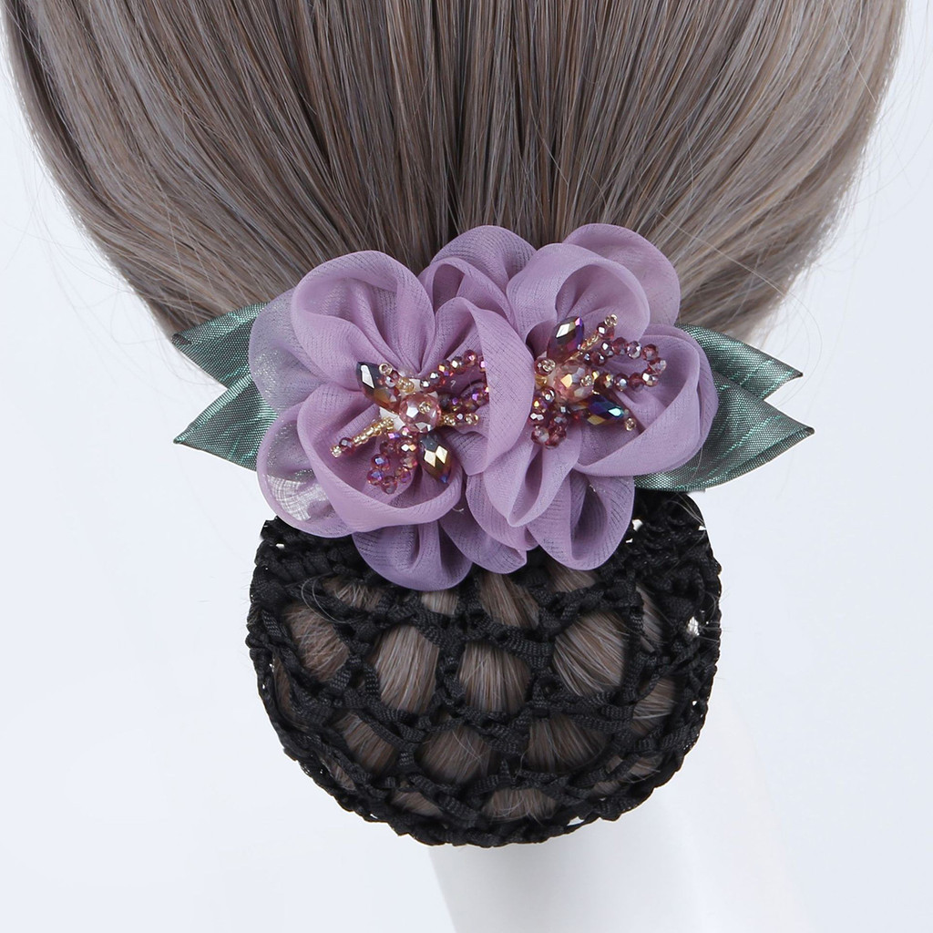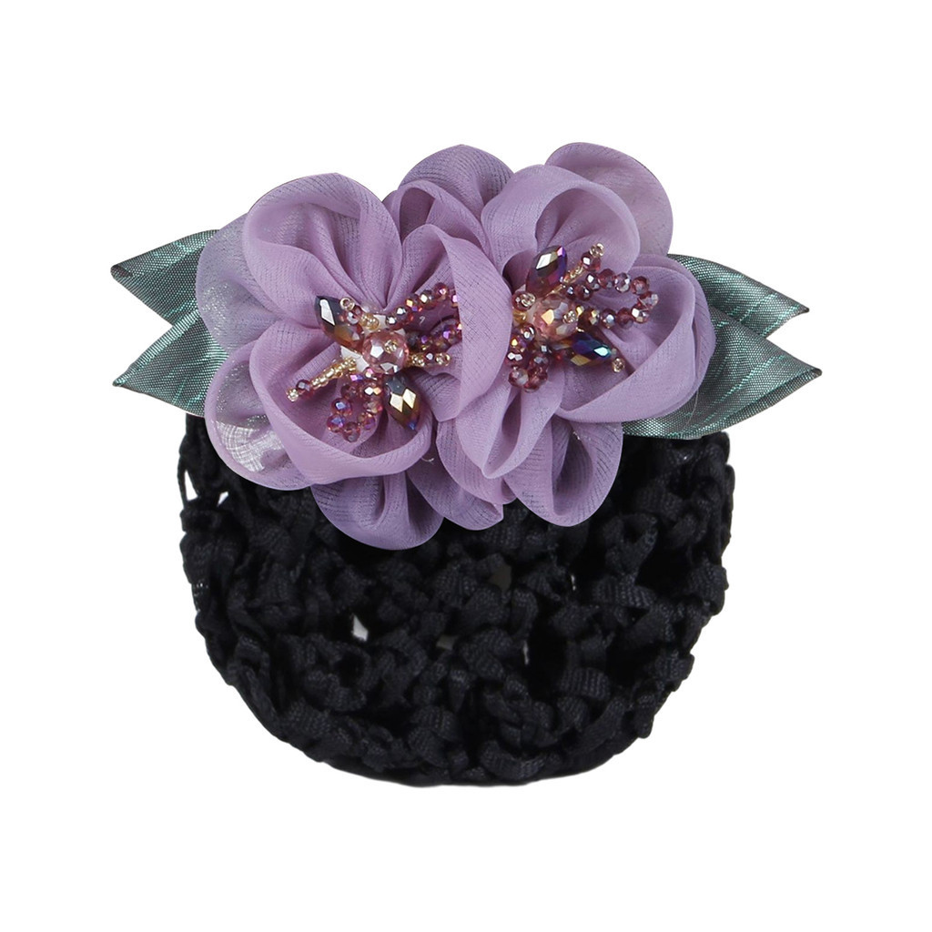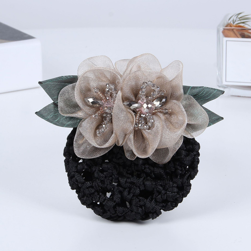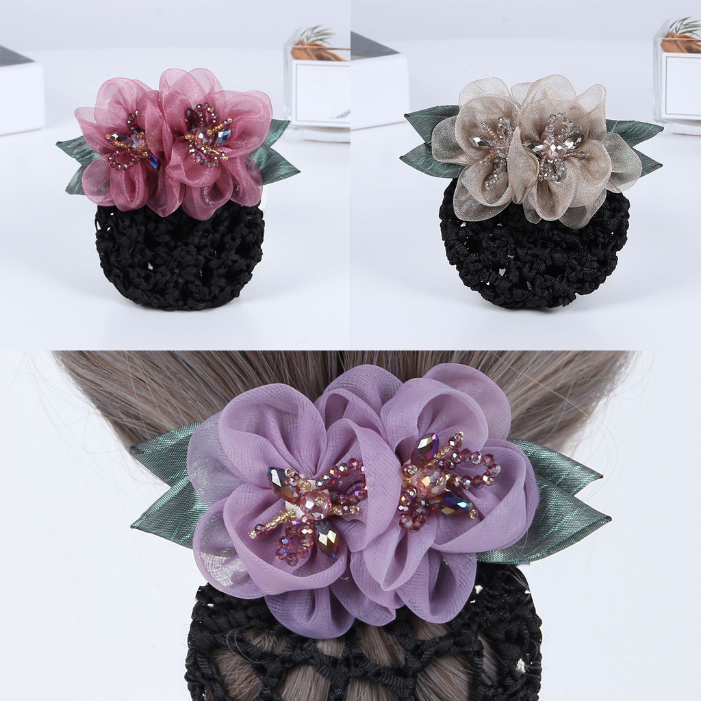 [YUE]ผู้หญิงผมสุทธิริบบิ้นดอกไม้ลูกปัด Bun Net Hairgrip Elegant Elastic Hair Barrette อุปกรณ์จัดแต่งทรงผม