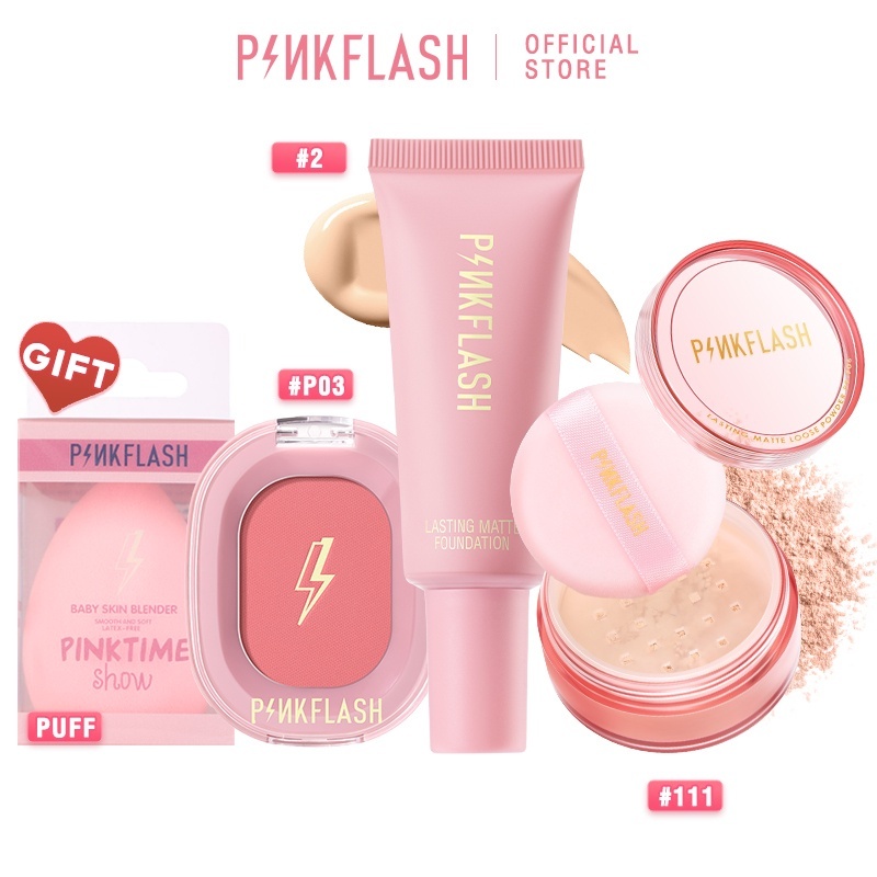 Pinkflash 4 ชิ้น ชุดแต่งหน้า หน้า บีบีครีม คอนซีลเลอร์ รองพื้น แป้งฝุ่น เซ็ตติ้ง กันน้ํา บลัชออน ควบคุมความมัน