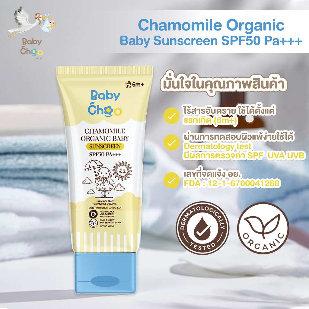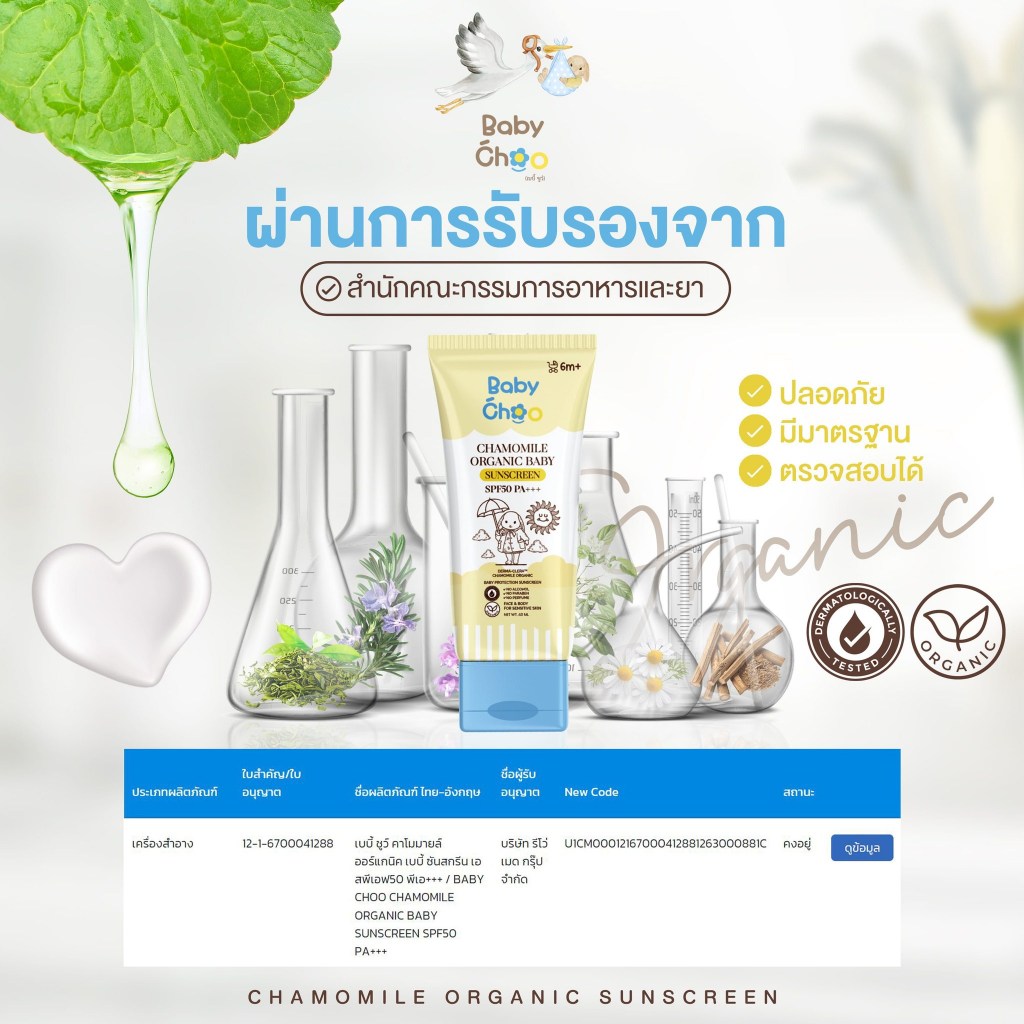 Baby Choo กันแดดสำหรับเด็ก ผิวนุ่มชุ่มชื้น อ่อนโยน เนื้อบางเบา ผิวเรียบเนียน Chamomile Organic Baby Sunscreen SPF50 PA++