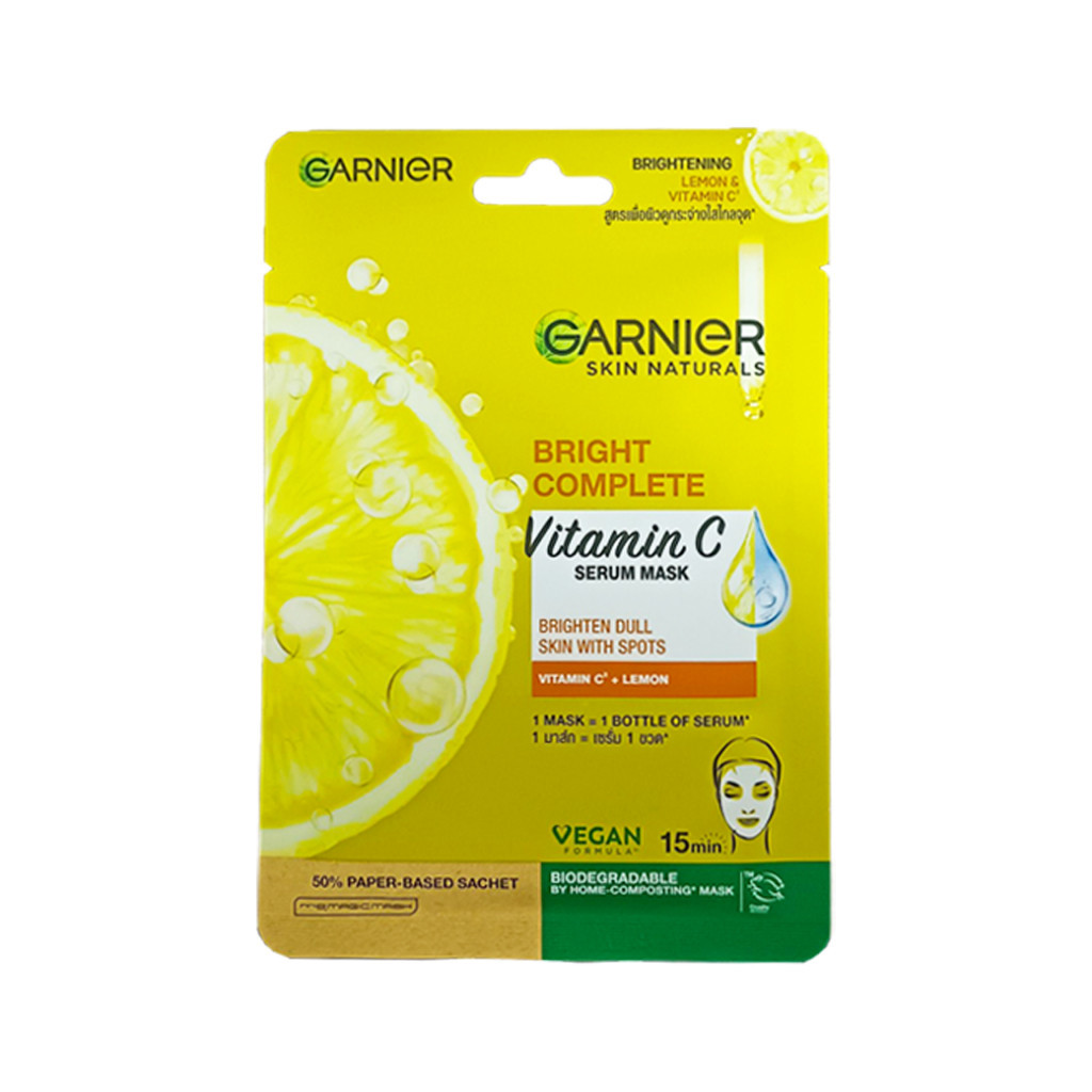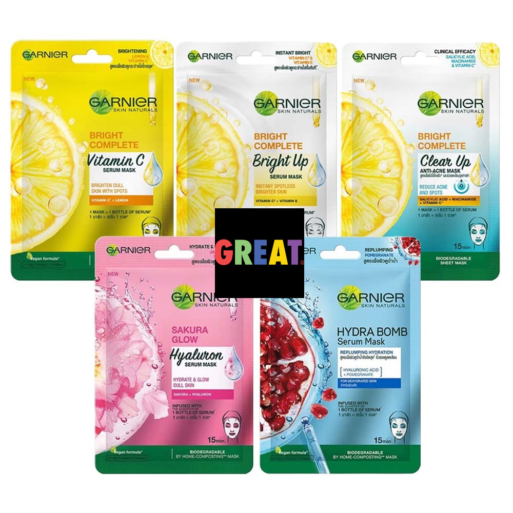 (ซอง) Garnier การ์นิเย่ สกิน แนทเชอรัลส์ วิตามิน ซี และ โกลว์ ไฮยาลูรอน เซรั่ม มาส์ก 3 สูตรให้เลือก