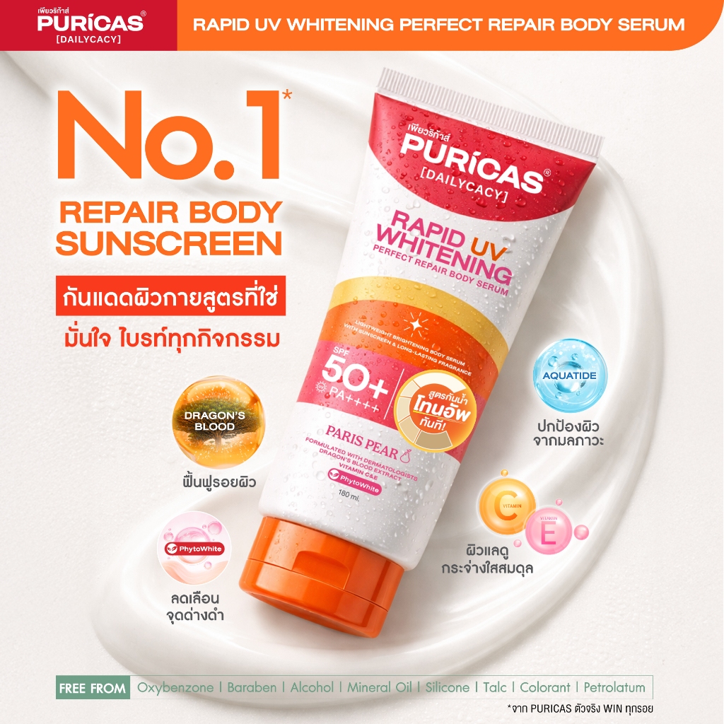 [สูตรใหม่ กันน้ำ] Puricas rapid uv whitening & perfect repair body serum 180ml. เซรั่มกันแดดผิวกาย