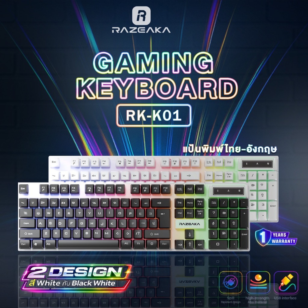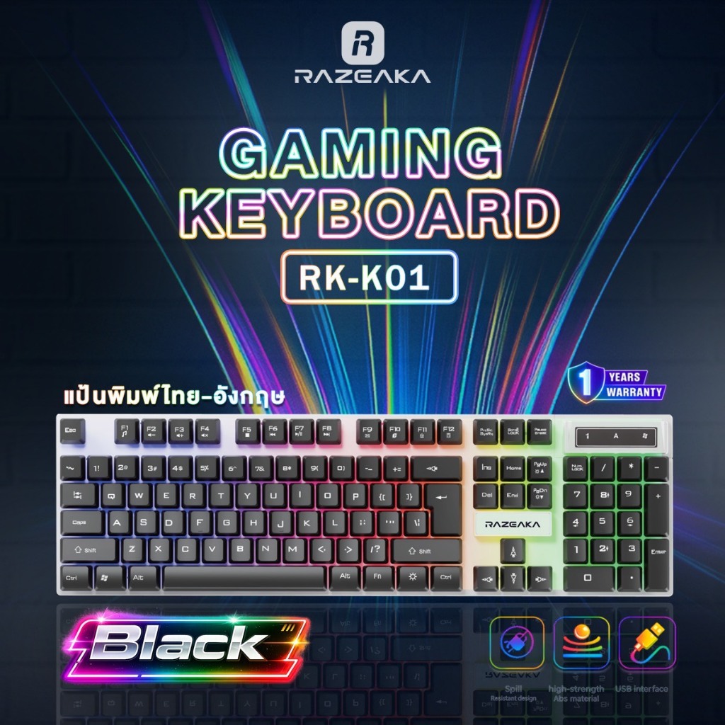 RAZEAKA RK-K01 คีย์บอร์ด Gaming Keyboard 104 Keys Full Size ไฟสีรุ้ง มีคีย์บอร์ดไทย-อังกฤษ
