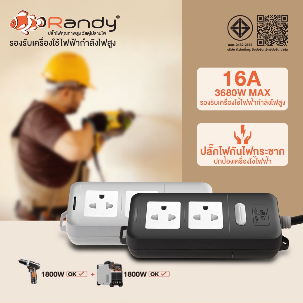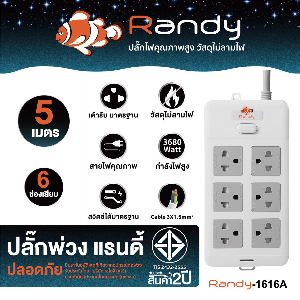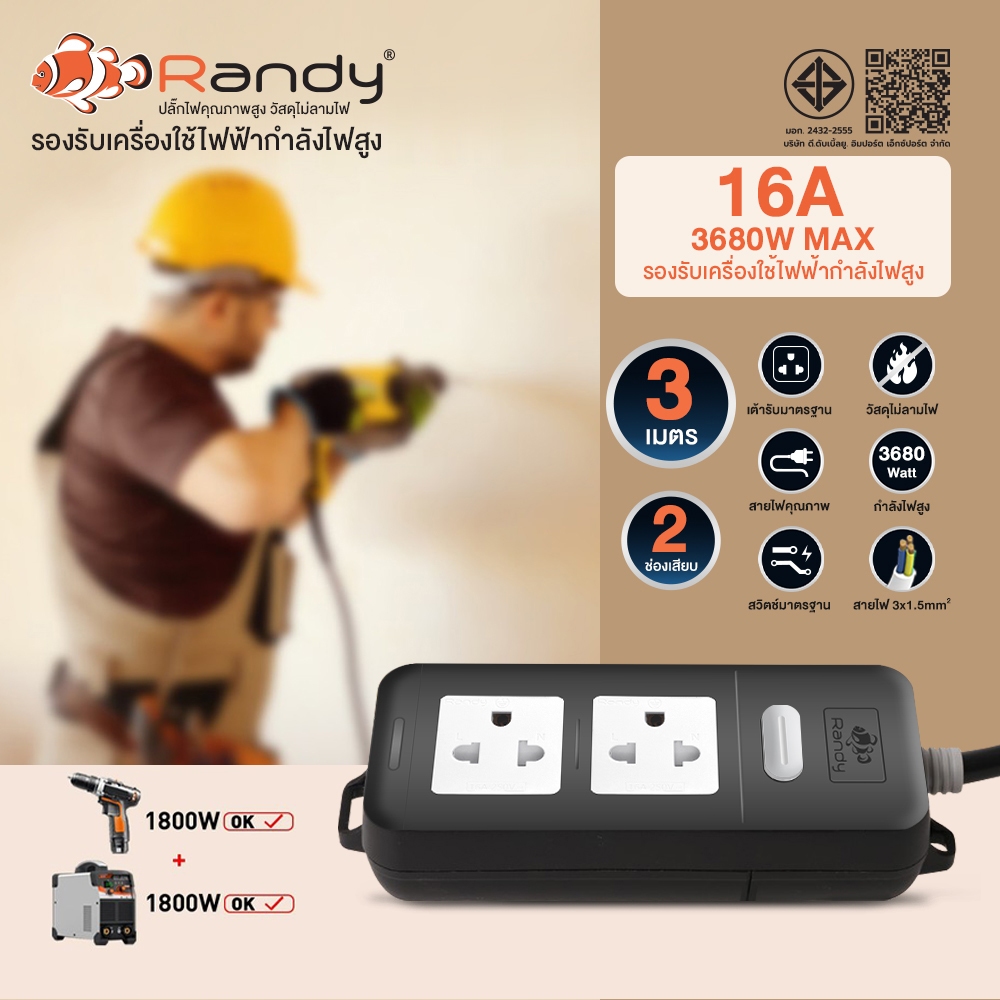 Randy ปลั๊กไฟ 2&6ช่อง 16A 3680W รับกำลังไฟสูง มอก. ปลั๊กพ่วง ปลั๊กไฟยาว 3M 5M10M20Mสายไฟ100%ทองแดง ปลั๊ก VCT1.5mm²X3สาย