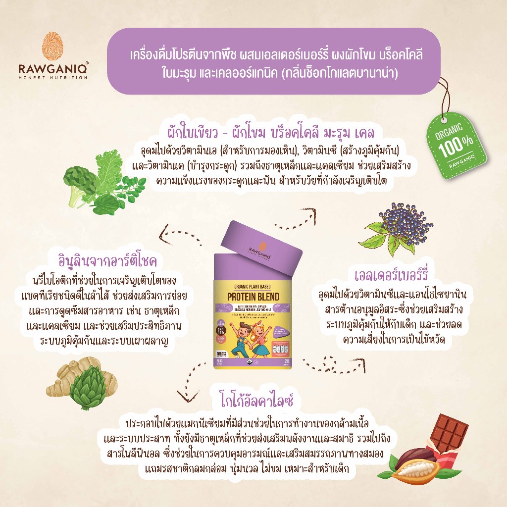Rawganiq โปรตีนพืชออร์แกนิค 5 ชนิด สูตรสำหรับเด็ก กลิ่นช็อคโกแลตบานาน่า USDA Organic Plant Based Protein for Kids