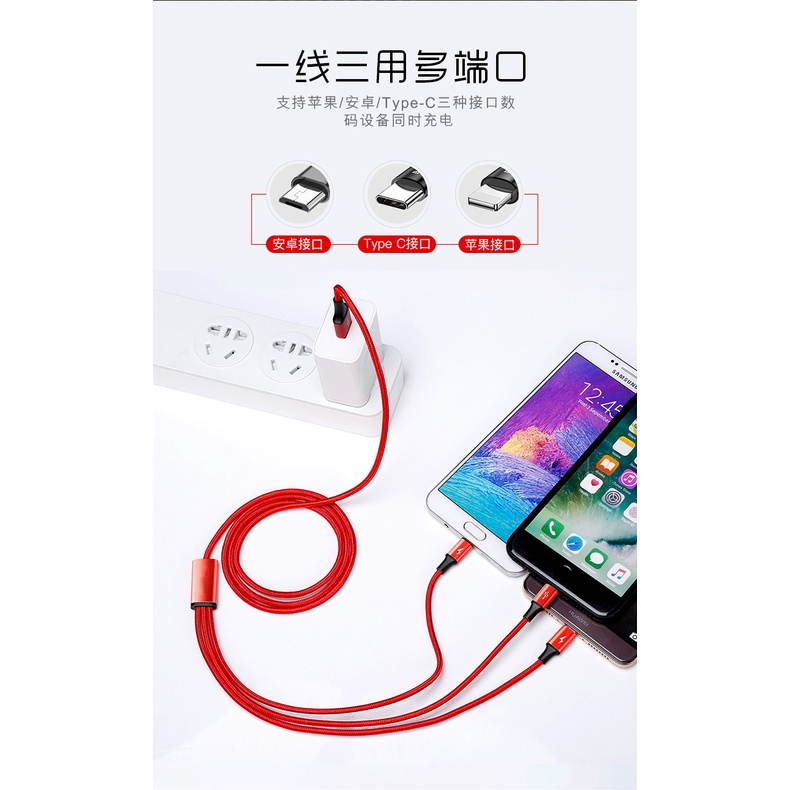 Ready 3 in 1 Charge Cable For iPhone Micro USB Type C Mobile Phone Fast Charging Cables Multiple USB Ports Multiple USB