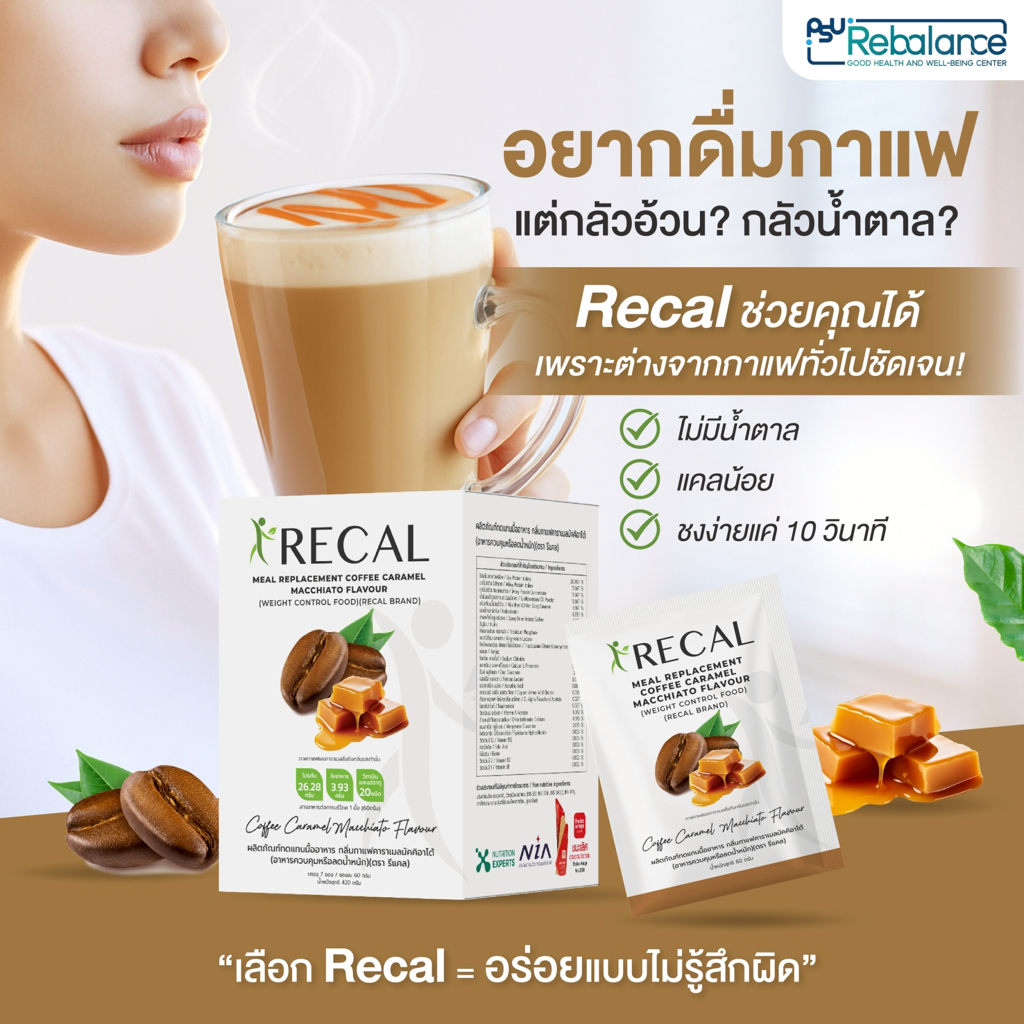 Recal Coffee Caramel Macchiato Flavour ผลิตภัณฑ์ทดแทนมื้ออาหาร กลิ่นกาแฟคาราเมลมัคคิอาโต้ Rebalance โปรตีนชง ลดน้ำหนัก
