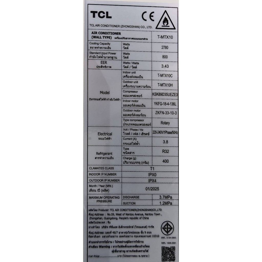 TCL เครื่องปรับอากาศ Inverter 9,500 BTU รุ่น T-MTX10C |ZWF|