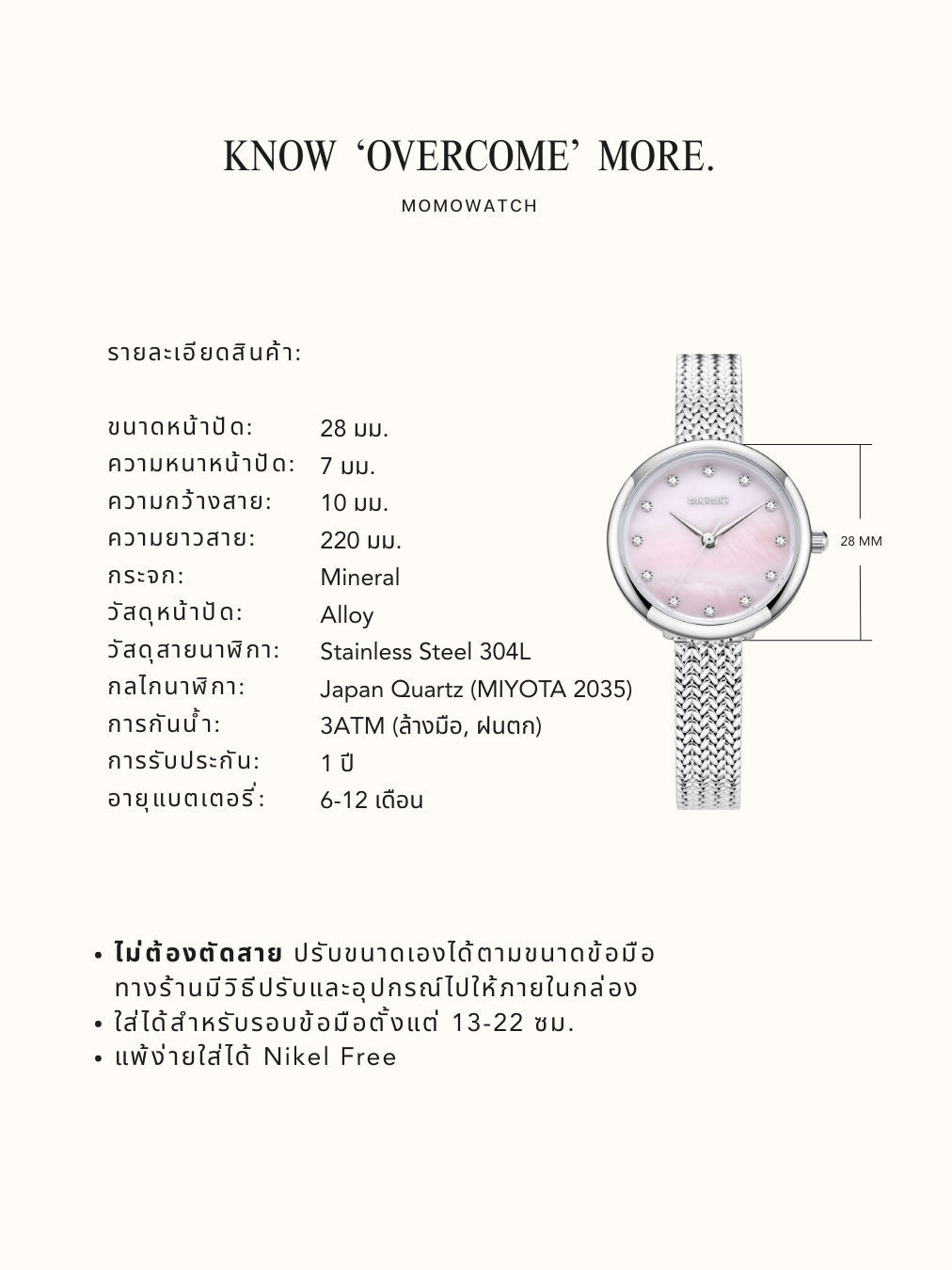 MOMOWATCH - OVERCOME - Women's Watch - นาฬิกาข้อมือผู้หญิง ปรับสายเองได้ตามขนาดข้อมือ ไม่ต้องตัดสาย