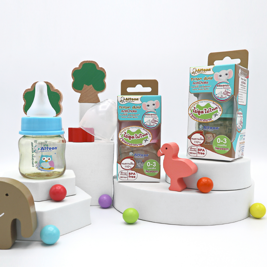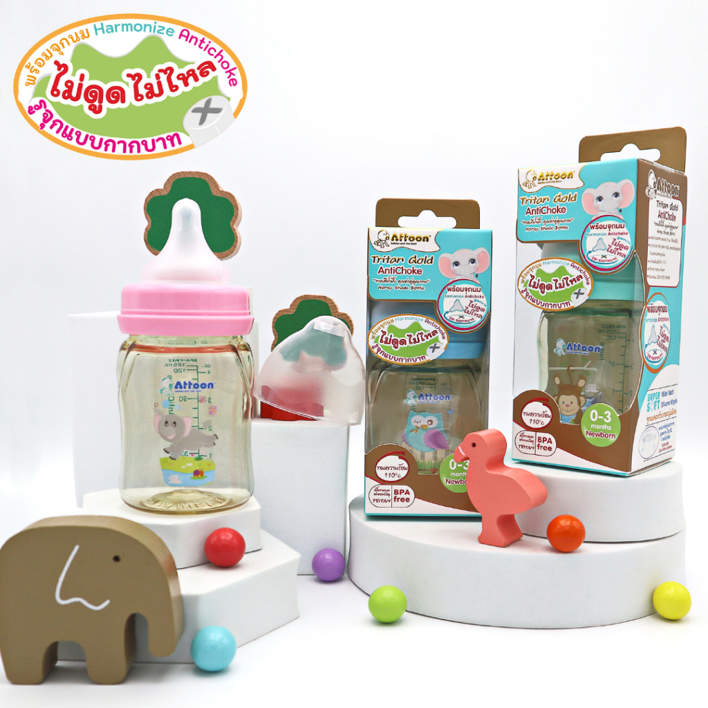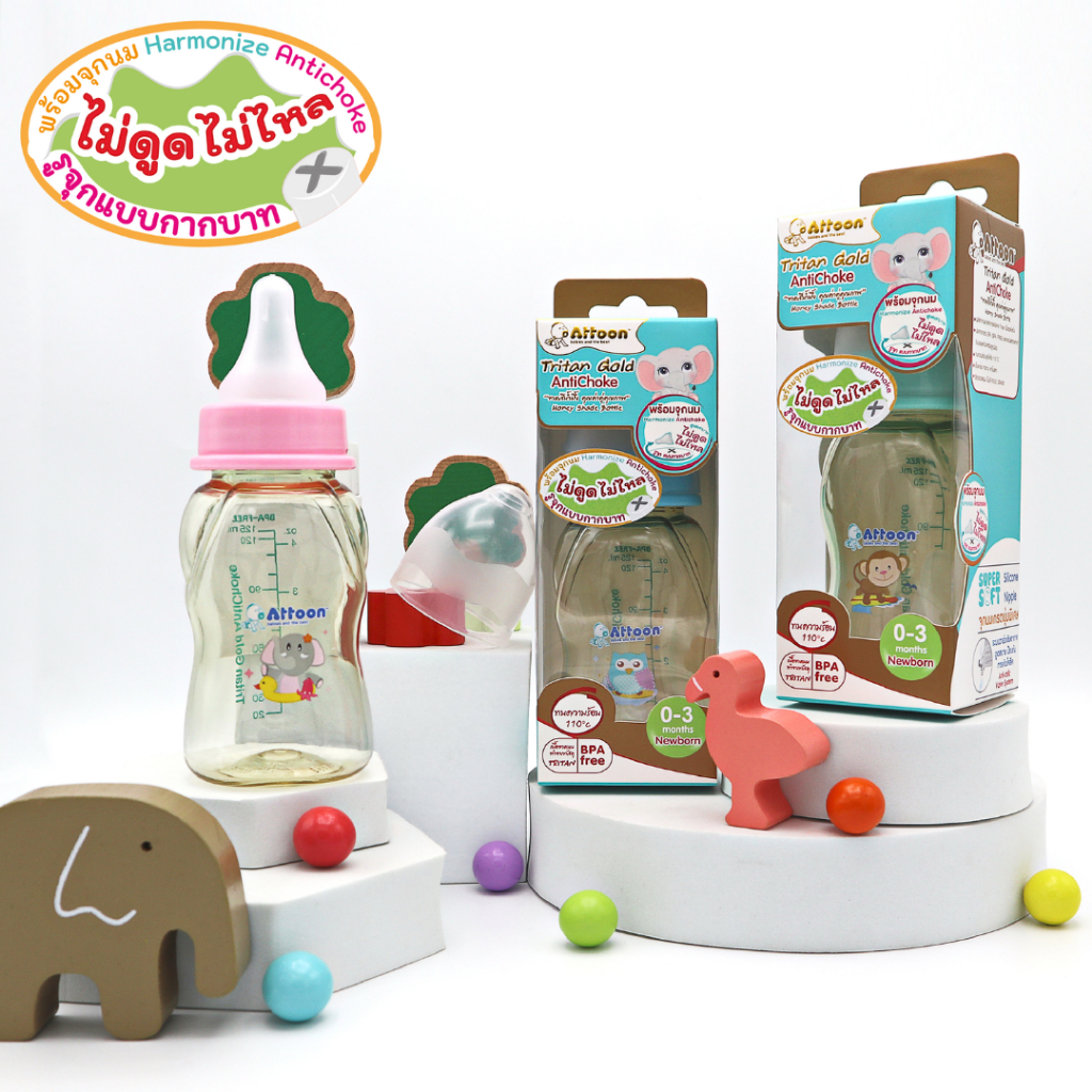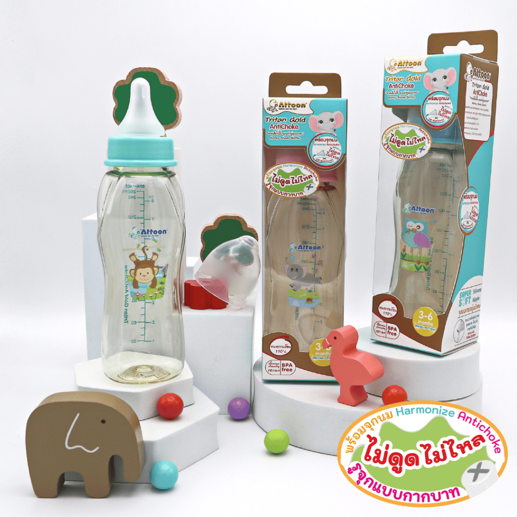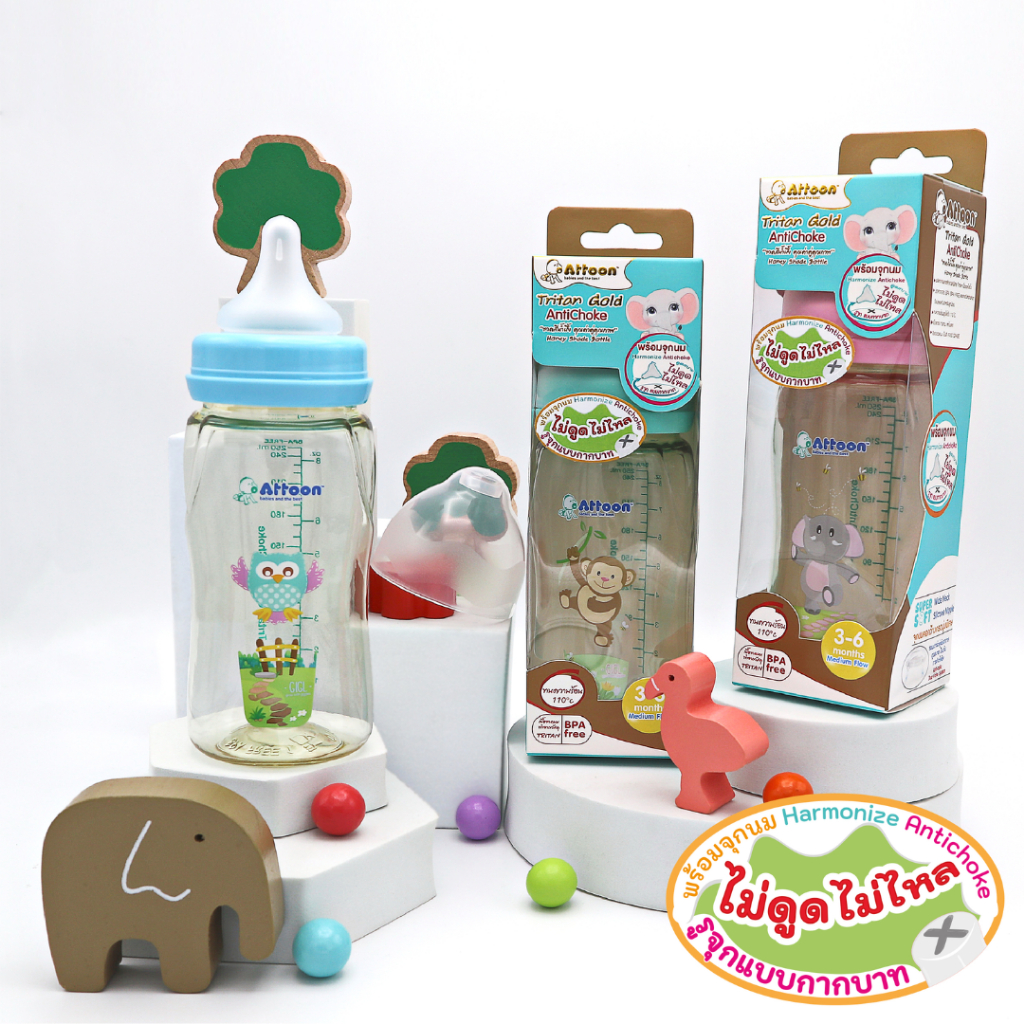 [จุกไม่ดูดไม่ไหล] Attoon ขวดน มคอแคบ ขวดนมคอกว้าง แอทตูน ขวดนมไตรตัน Tritan Gold AntiChoke