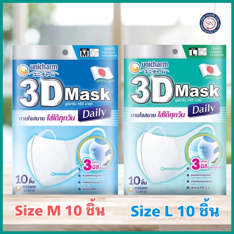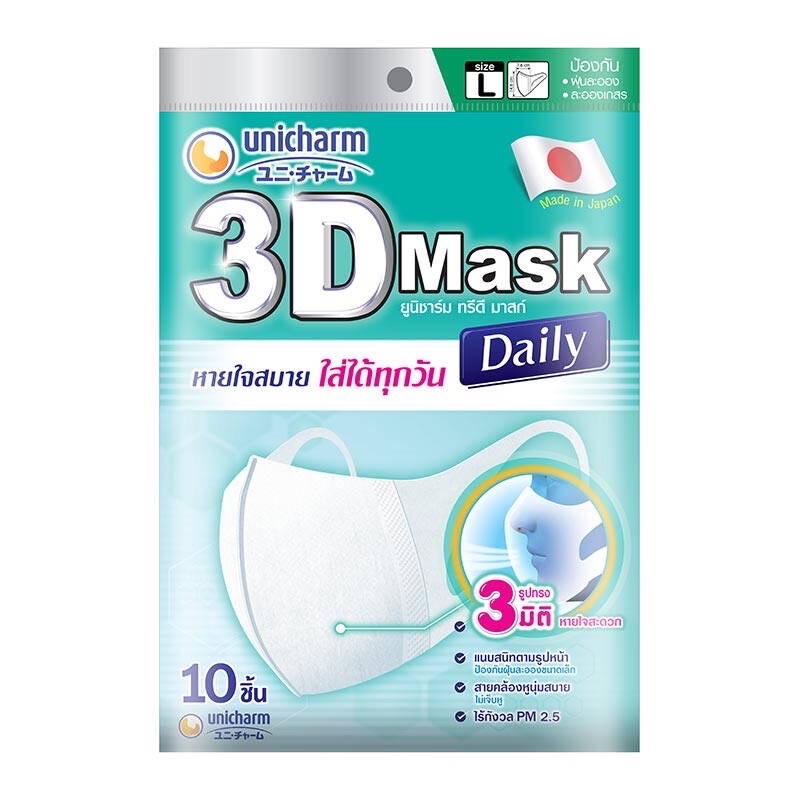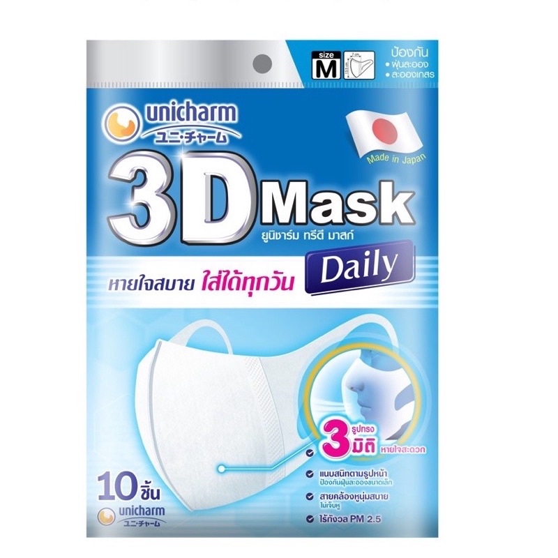 Unicharm ยูนิชาร์ม ทรีดี มาสก์ เดลี่ หน้ ากากอนามัย ขนาด M 10 ชิ้น และ L 10 ชิ้น