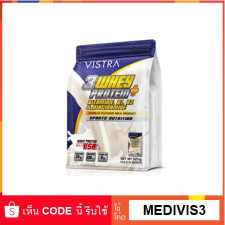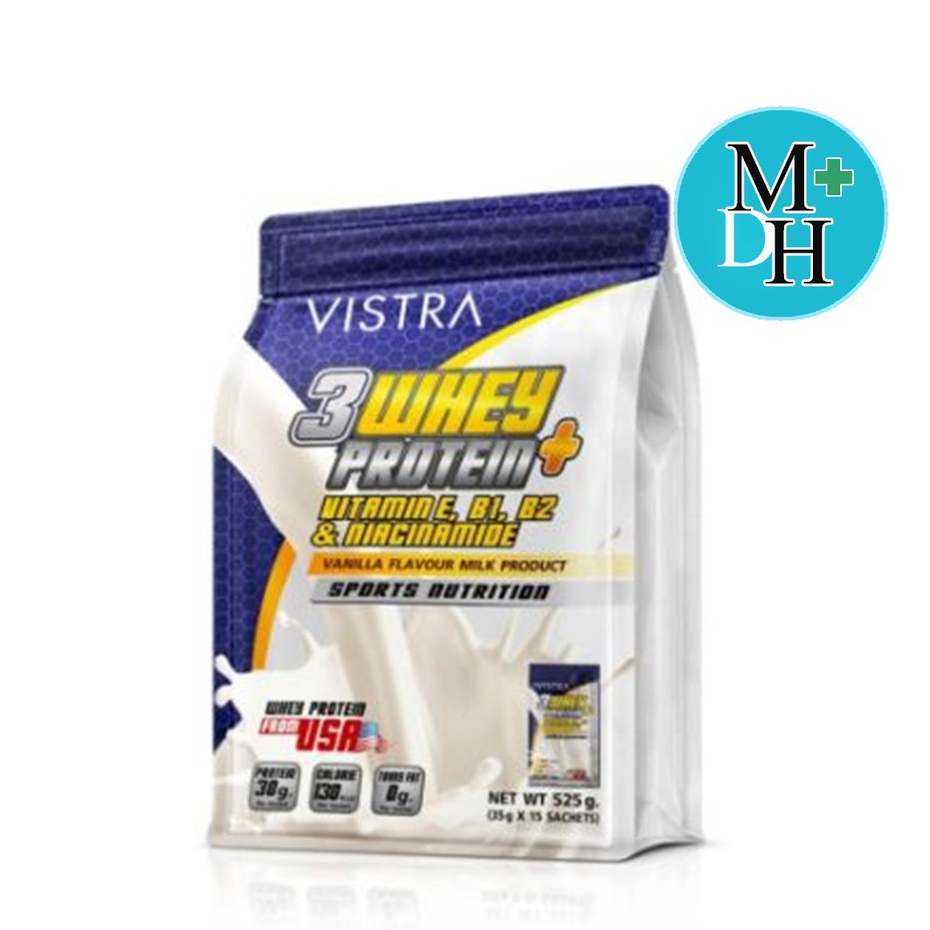 VISTRA 3 WHEY PROTEIN PLUS VANILLA 525 กรัม บรรจุ 15 ซอง วิสทร้า 3 เวย์ โปรตีน พลัส วนิลา 15369