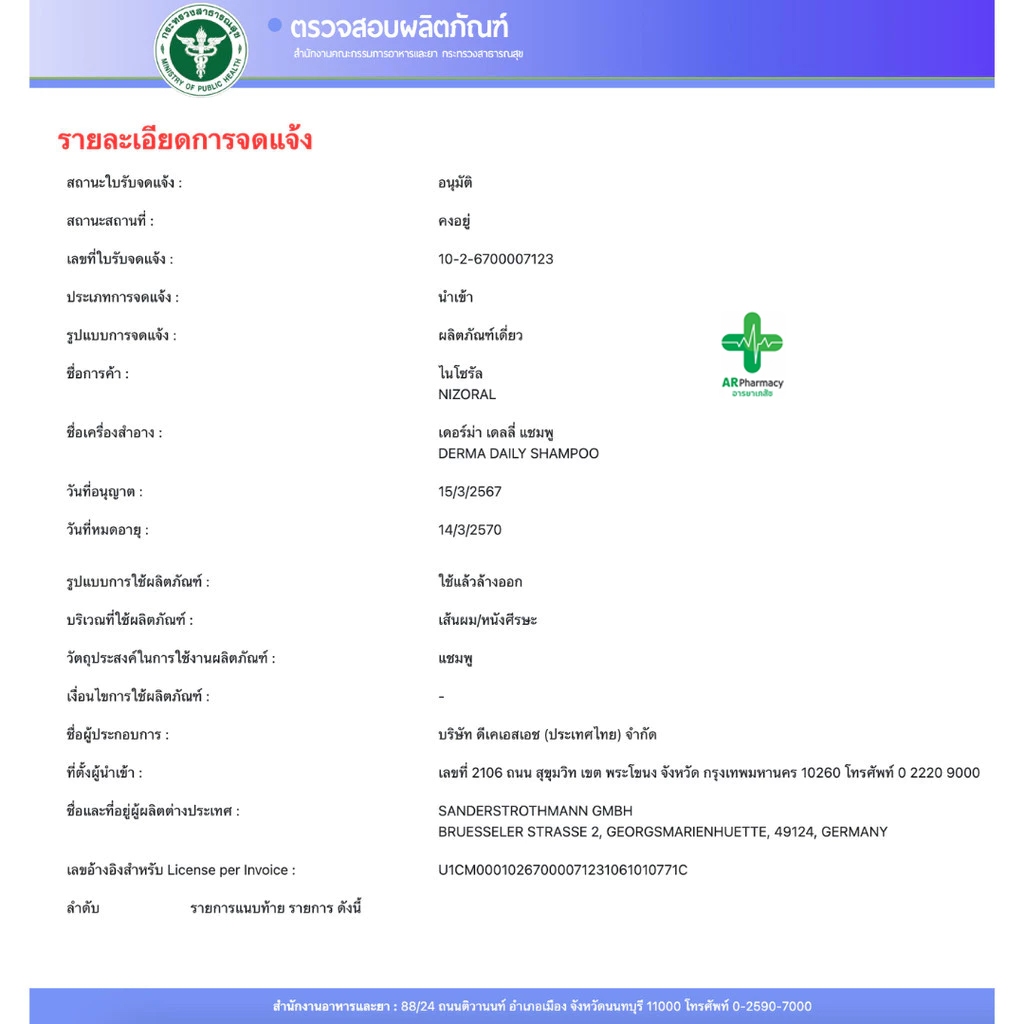 🔥พร้อมส่ง🔥 Nizoral Derma Daily Anti-Dandruff Shampoo แชมพูสำหรับผมและหนังศีรษะมันหรือบอบบาง ขนาด 200 ml