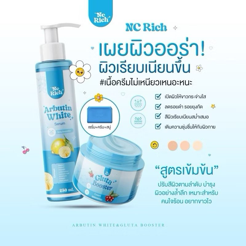 โฉมใหม่ NC RICH Arbutin White Gluta Booster เซรั่ม โดสฟ้า อาร์บูติน ครีมกลูต้า บูตเตอร์ สบู่โกจิต