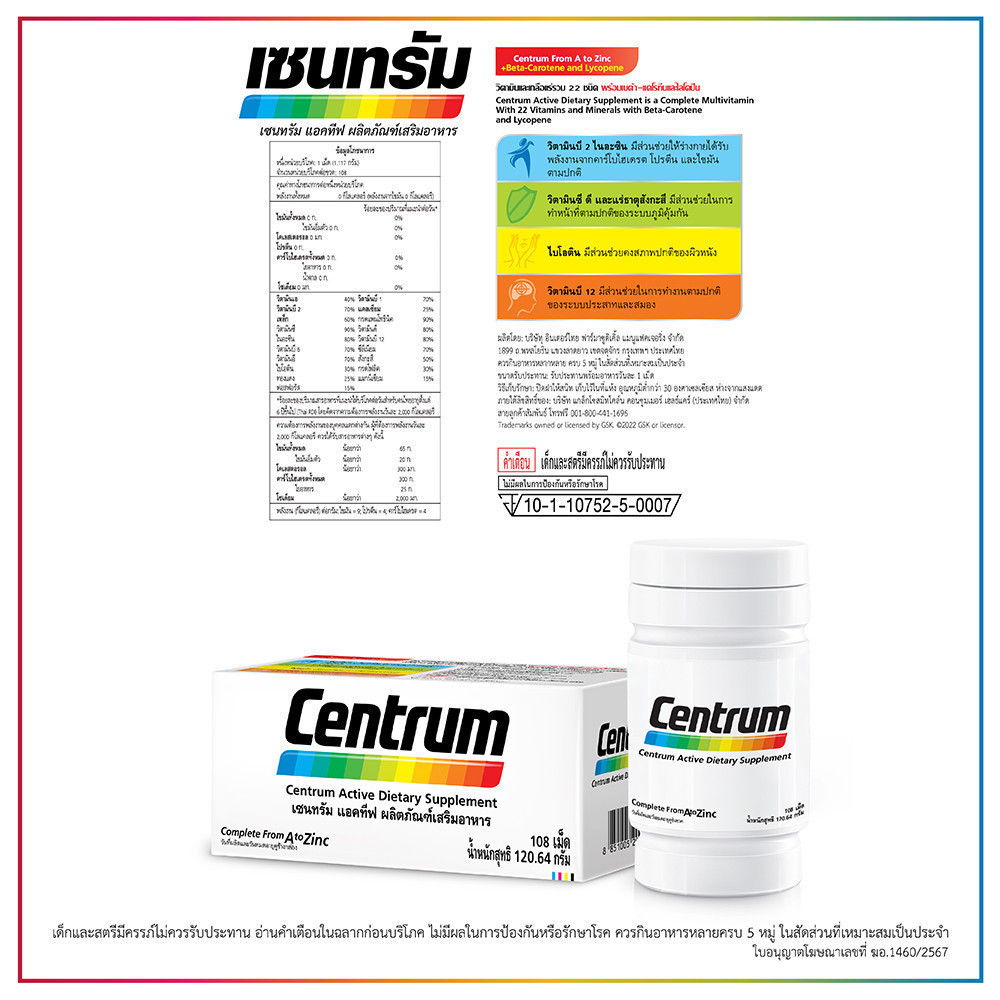 [ส่งฟรี] CENTRUM ACTIVE DIETARY SUPPLEMENT 108s x4 เซนทรัม ผลิตภัณฑ์เสริมอาหาร วิตามินรวม สำหรับทุกคน 108 เม็ด แพ็ค 4