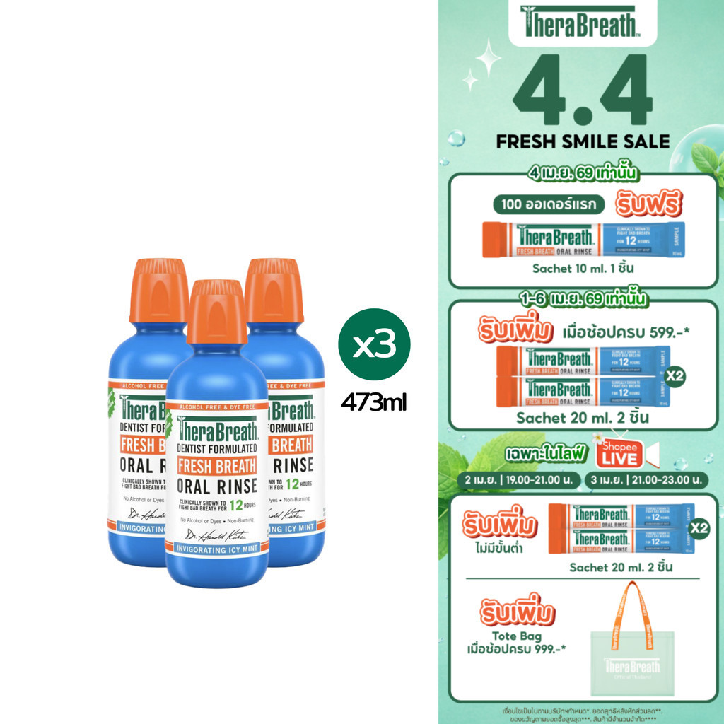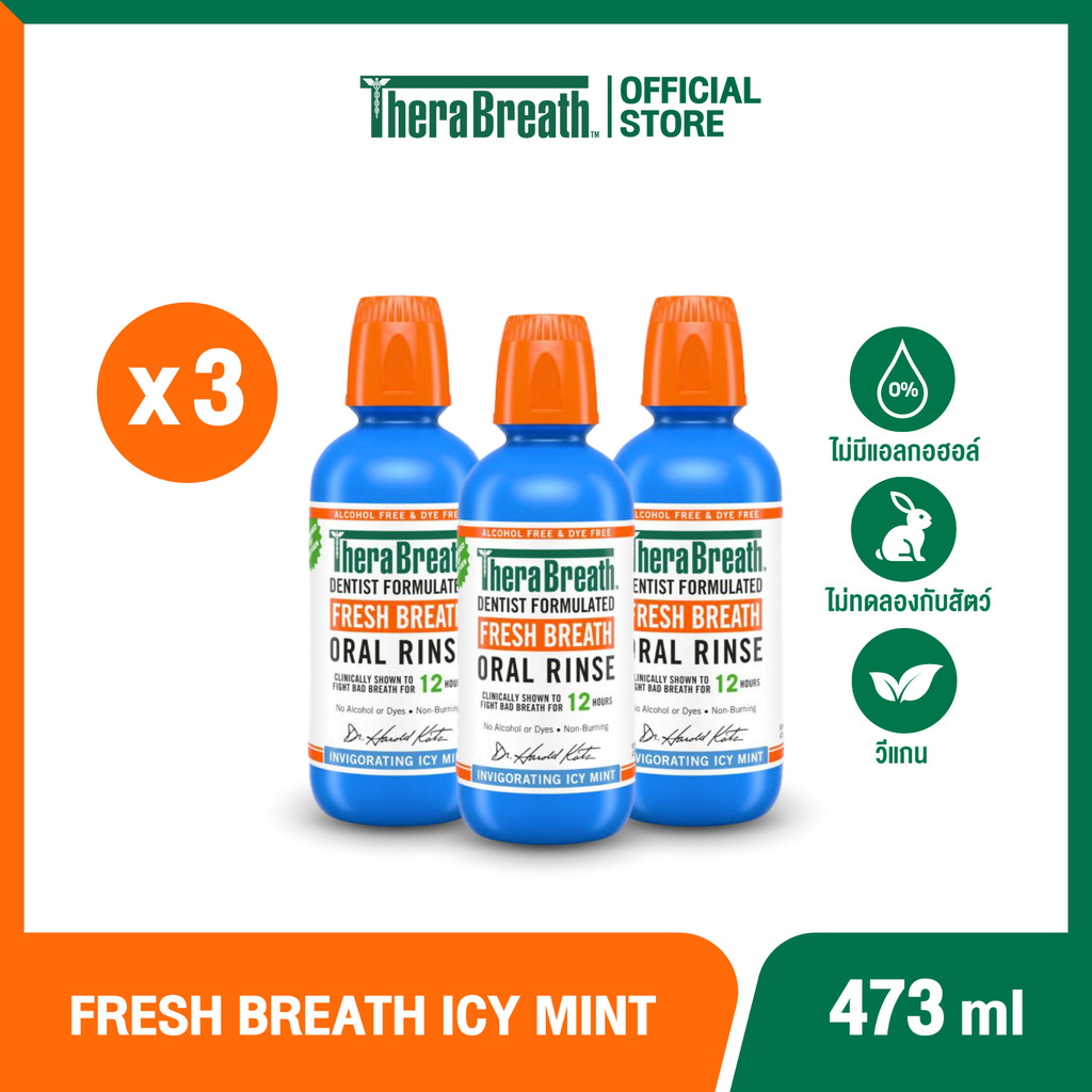 [แพ็คx3] TheraBreath 473 ml สูตร Invigorating Icy Mint - Mouthwash น้ำยาบ้วนปาก ลดกลิ่นปาก ไม่มีแอลกอฮอล์