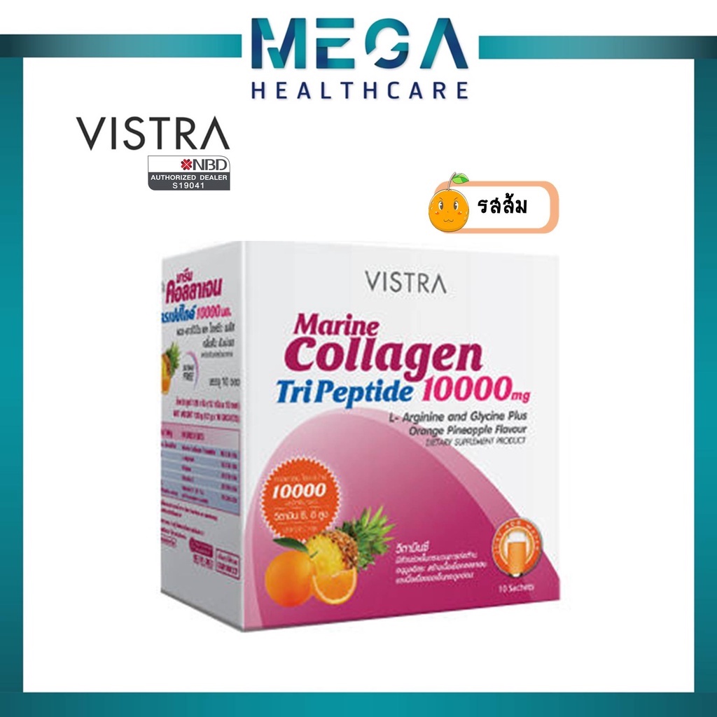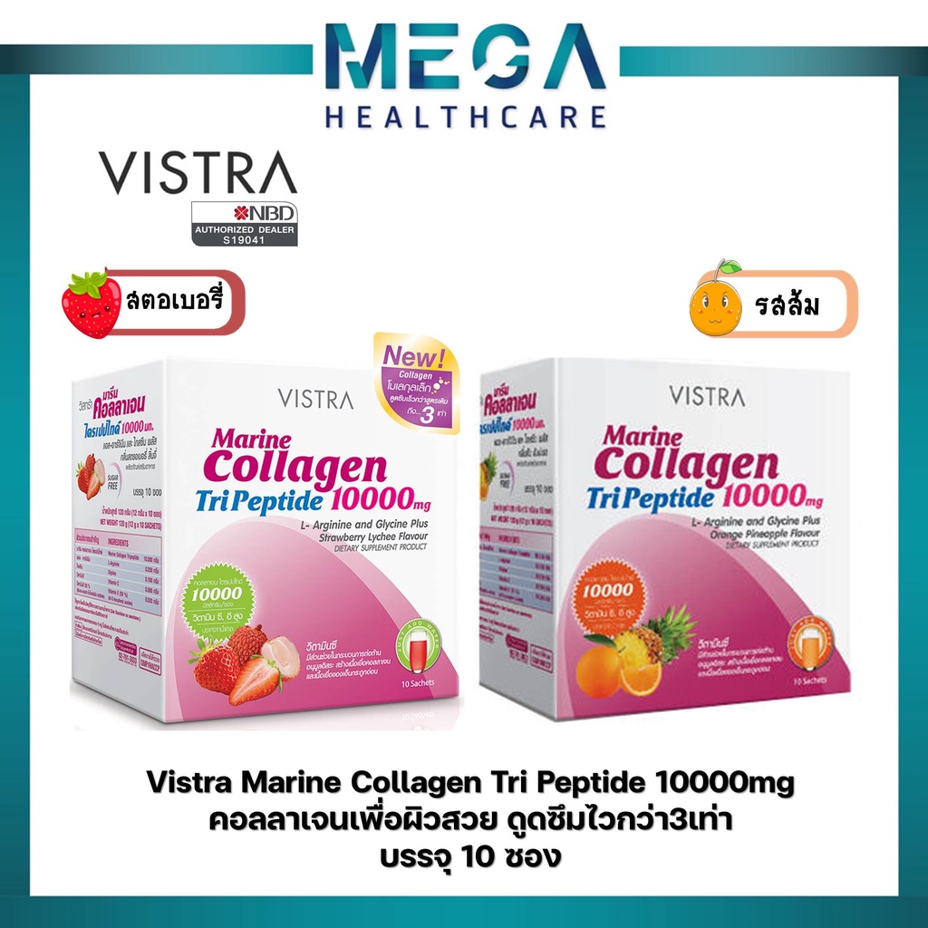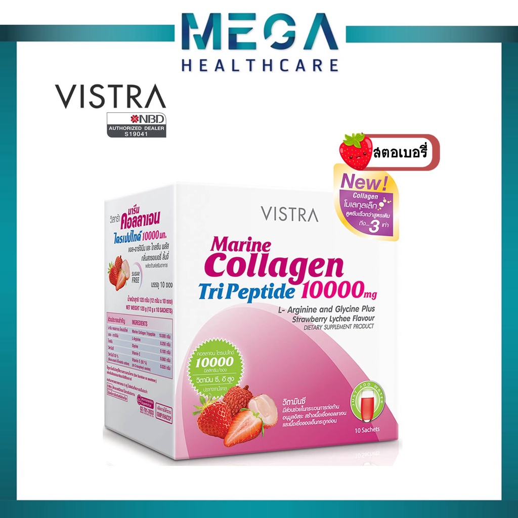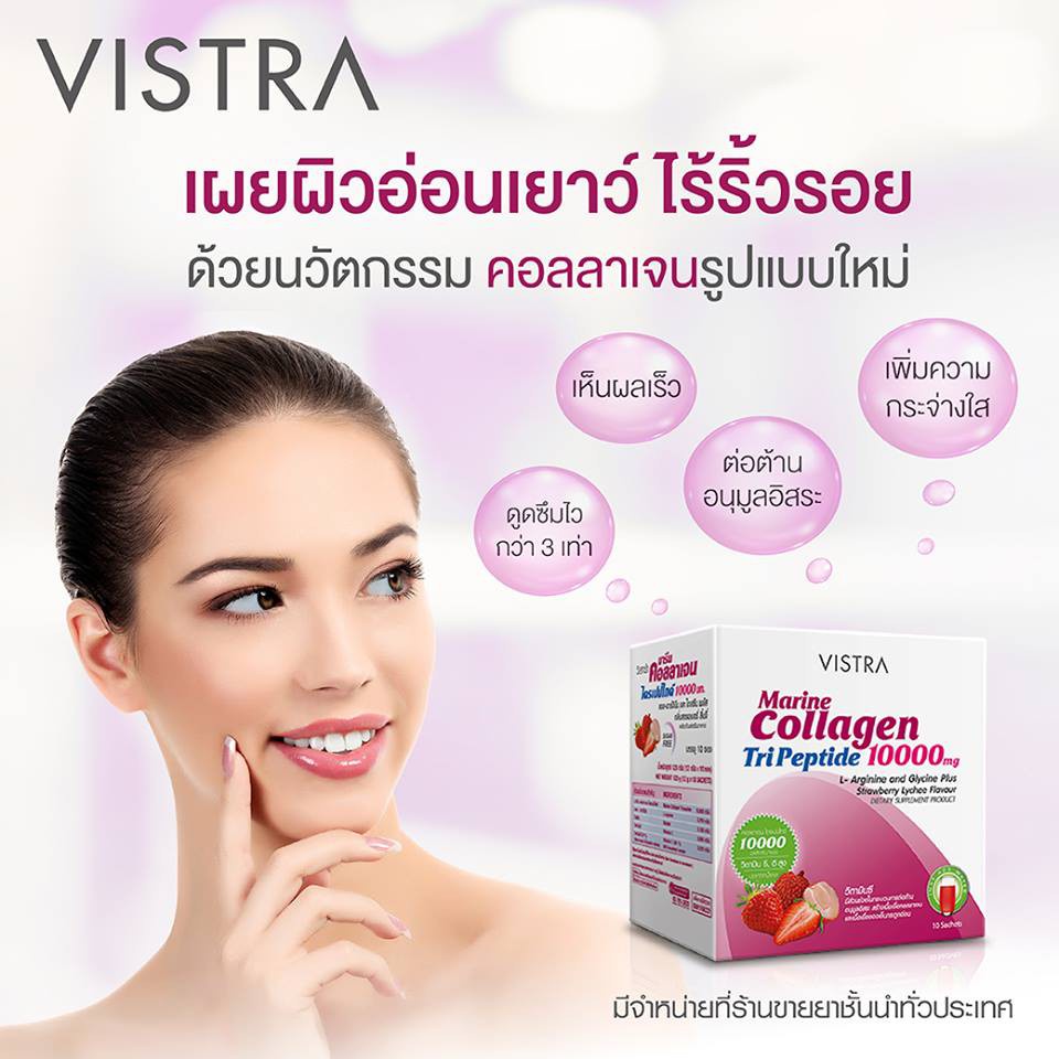 VISTRA Marine Collagen Tri Peptide 10000 mg (10 ซอง) คอลลาเจน บำรุงผิว ผิวขาวใส กลิ่นสตรอเบอรี่ ลิ้นจี่/ส้ม สัปปะรด