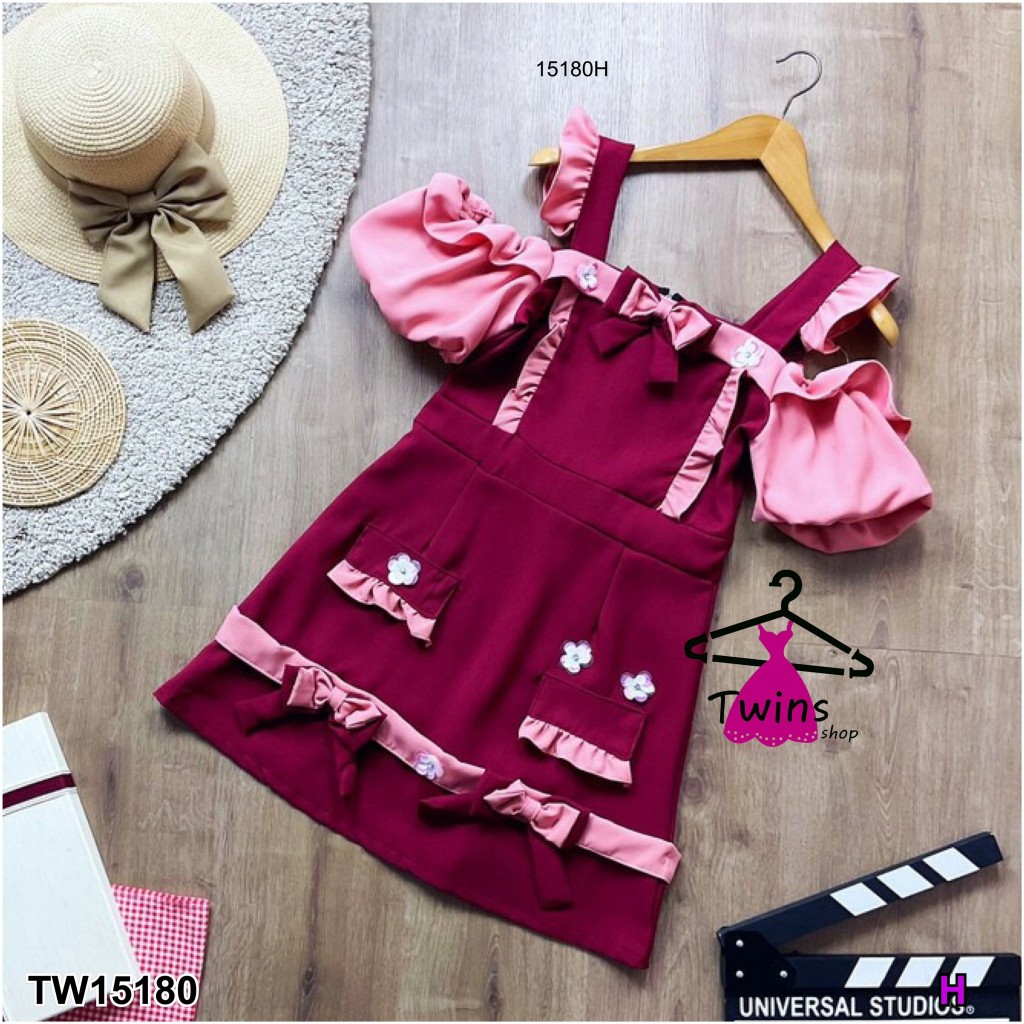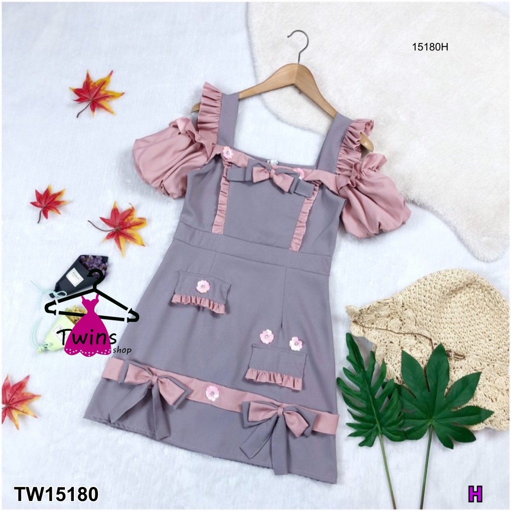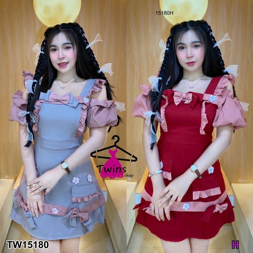TwinsShopVip💗พร้อมส่ง TW15180 เดรสเปิดไหล่แขนพองอกติดโบว์