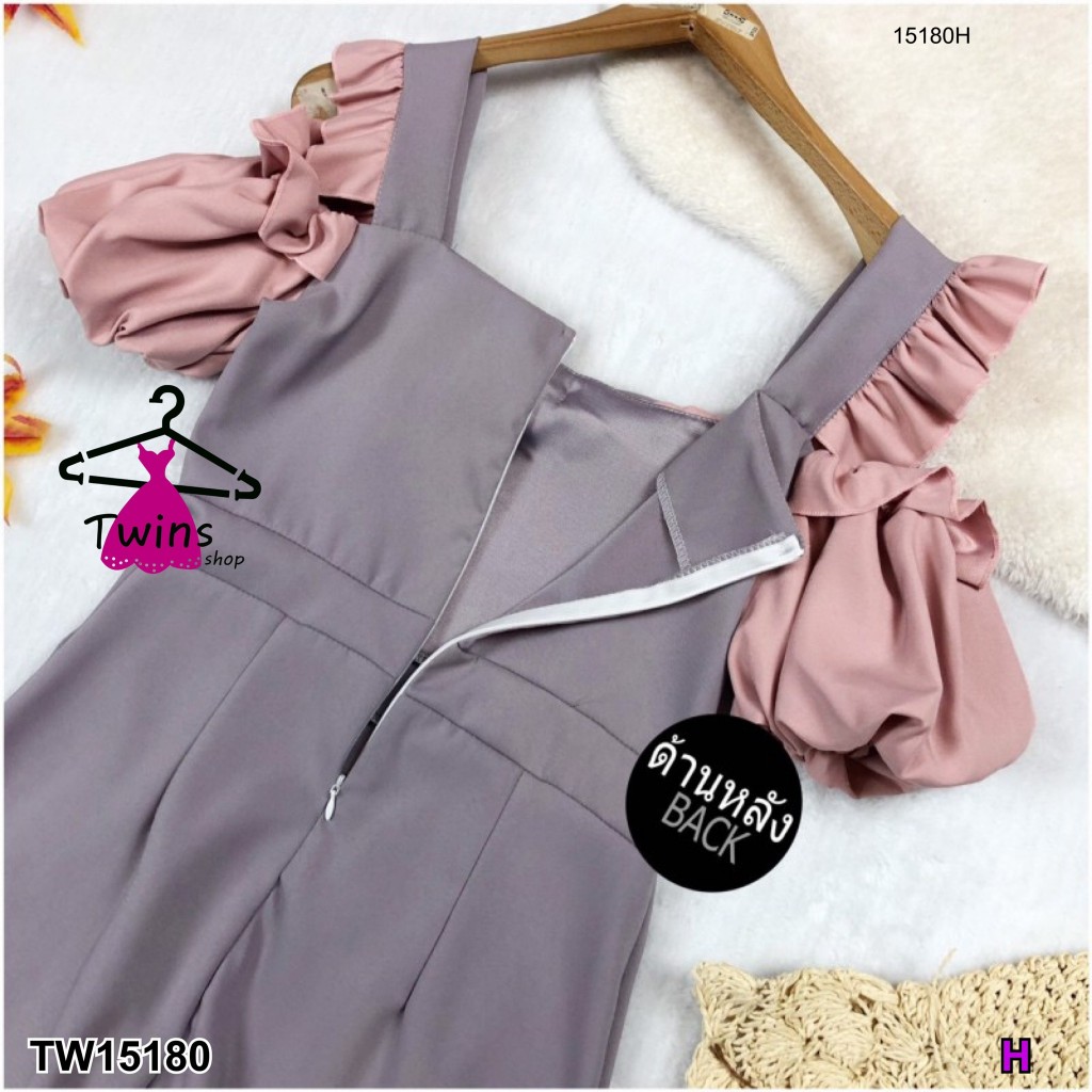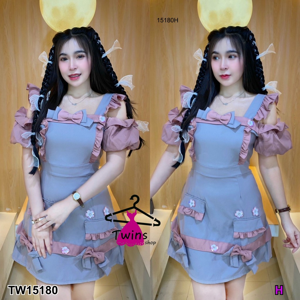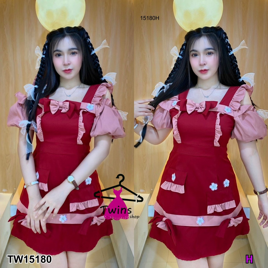 TwinsShopVip💗พร้อมส่ง TW15180 เดรสเปิดไหล่แขนพองอกติดโบว์