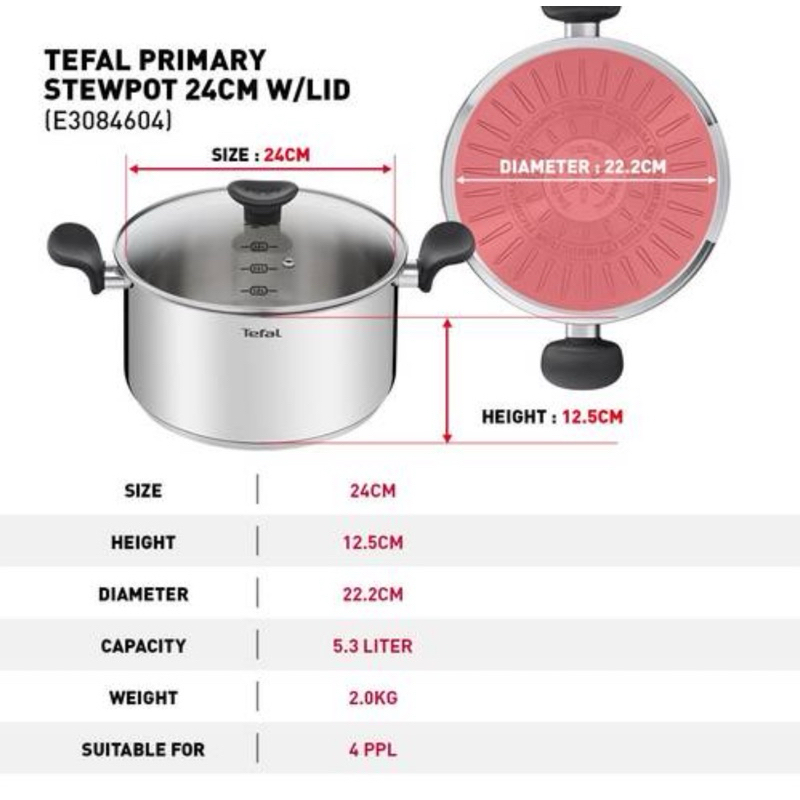 🔥🔥 Tefal หม้อสองหู ขนาด 24 cm. 4 ลิตร รุ่น Primary E3084604 (สามารถใชักับเตาแม่เหล็กไฟฟ้าได้) รับประกันศูนย์2ปี