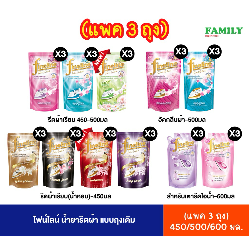 (แพค3) Fineline ไฟน์ไลน์ น้ำยารีดผ้าเรียบ/อัดกลีบ ชนิดถุงเติม ขนาด 450/500/600 มล.