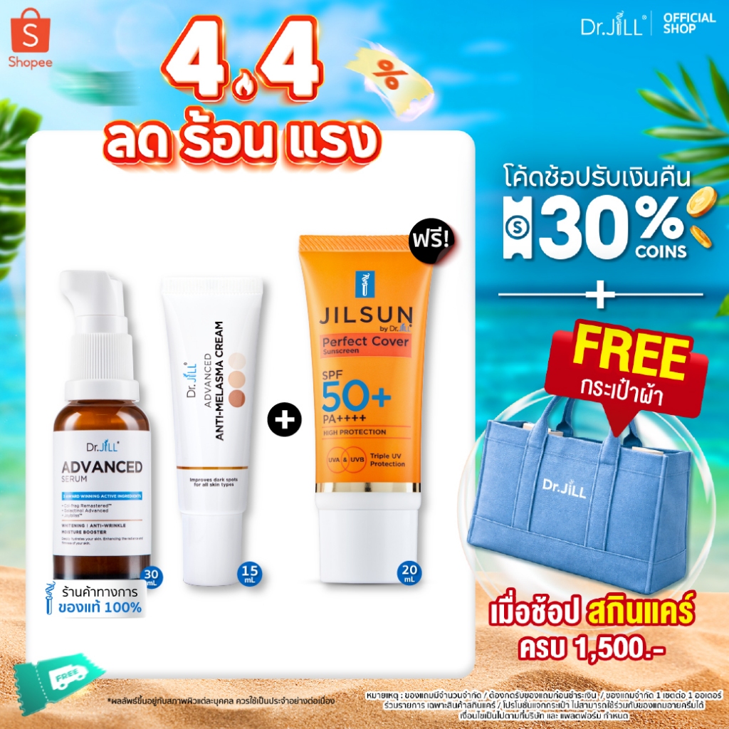 [ส่งฟรี] Dr.JiLL Advanced Serum ดร.จิล สูตรใหม่ 1 ขวด + Melasma ครีมทาฝ้า 1 หลอด+JILSUN Perfect Cover